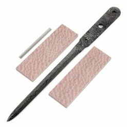 This damascus letter opening blade blank design is called the “Executive”. It is a USA Made carbon steel damascus fixed blade knife blank that is double-ground and ready to build. This model will make a great executive letter opener. The Executive also makes a great gift project for hobby builders. With a blade length of 5.0 inches and an overall length of 9.0 inches, this classic letter opener is perfect for the task. Ground on both sides, the Executive’s blade is 0.4375 inches wide with a 0.120 inch thickness. This damascus knife blank model features (2) 0.125 inches and (1) 0.250 inch through-holes for handle construction (stainless steel pinstock included). The tang holes can be easily modified to work with larger pinstock or threaded fasteners.