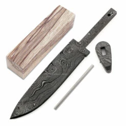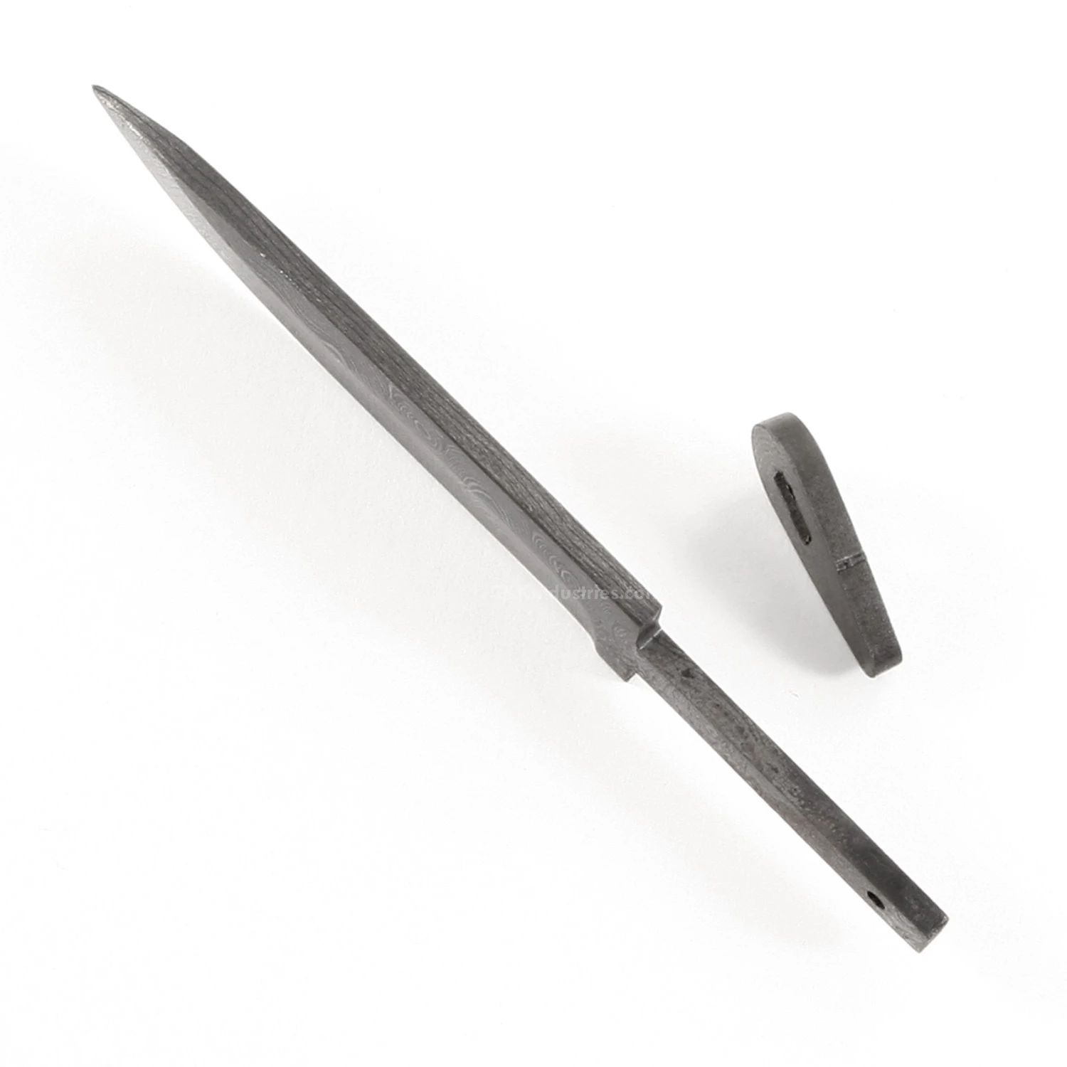 This damascus hidden tang blade blank is called the “Fire Ant”. It is a USA Made carbon steel damascus fixed blade knife blank that is hollow-ground and ready to build. This skinning knife kit model will make a great mini-skinning knife project for the DIY builder. It is expertly designed and well made and comes with a matching damascus guard. With a blade length of 3.00 inches and an overall length of 4.625 inches, this hidden tang skinning knife blank design is a perfect for boot sheaths or side carry. Hollow ground on both sides, the Fire Ant’s blade is 0.685 inches wide. This design features (1) 0.095 inches pre-drilled through-hole for handle construction (stainless steel pinstock included). The tang width is 0.25 inches and can be modified with ease to work with small pinstock, or with a threaded end fastener.