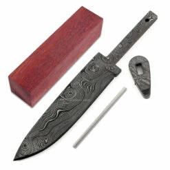 This damascus hidden tang blade blank is called the “Fire Ant”. It is a USA Made carbon steel damascus fixed blade knife blank that is hollow-ground and ready to build. This skinning knife kit model will make a great mini-skinning knife project for the DIY builder. It is expertly designed and well made and comes with a matching damascus guard. With a blade length of 3.00 inches and an overall length of 4.625 inches, this hidden tang skinning knife blank design is a perfect for boot sheaths or side carry. Hollow ground on both sides, the Fire Ant’s blade is 0.685 inches wide. This design features (1) 0.095 inches pre-drilled through-hole for handle construction (stainless steel pinstock included). The tang width is 0.25 inches and can be modified with ease to work with small pinstock, or with a threaded end fastener.