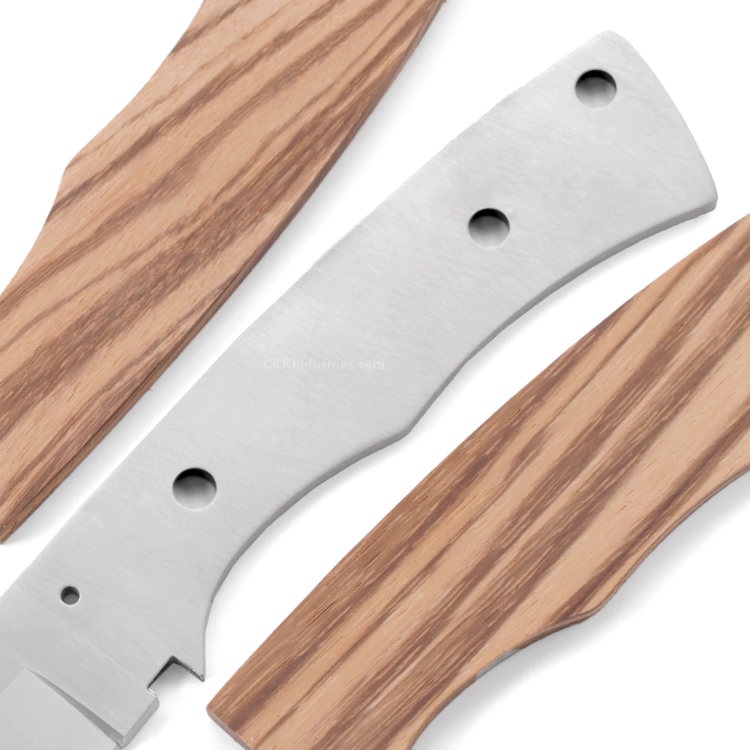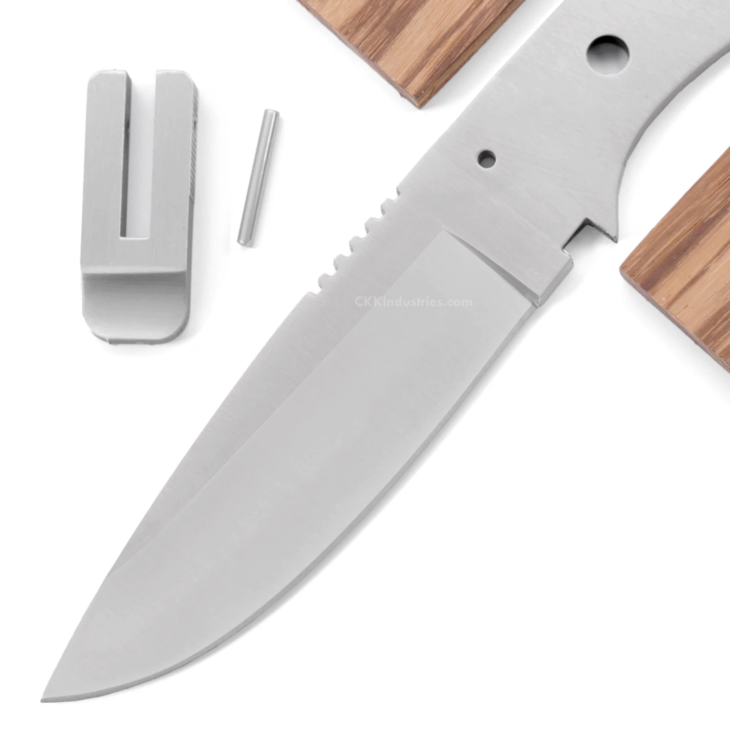 This version is the pre-machined handle combo kit. It comes with the Full Tang Hunter blade blank, guard, guard pin, plus one pair of pre-machined Zebrawood knife handle scales with stainless steel pinstock to simplify the completion process. Add a touch of proper finishing and create a fabulous knife design that you’ll be proud to own, carry, and use.
