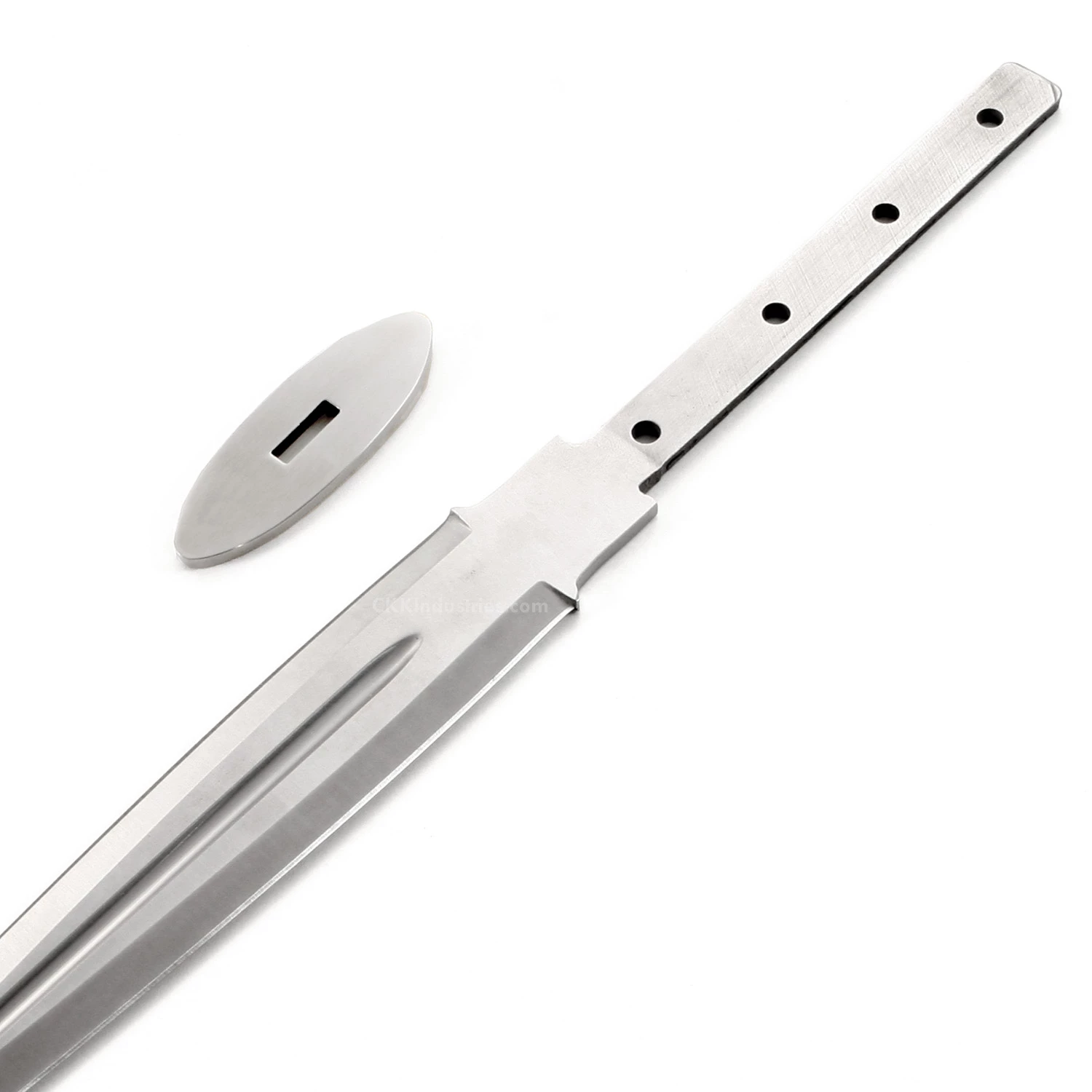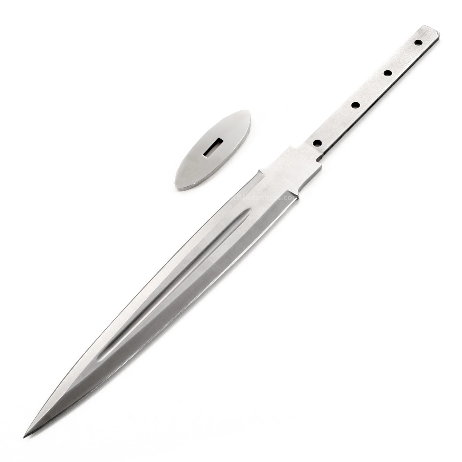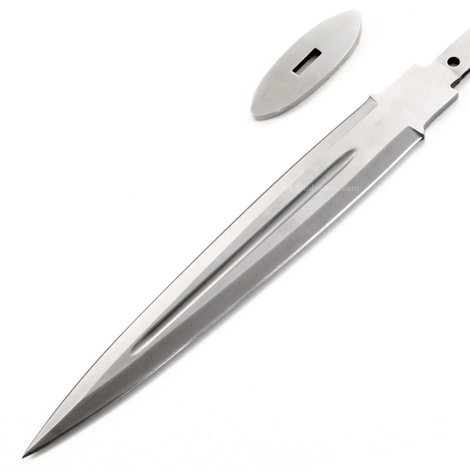 The Gentleman Dirk with 416SS Oval Guard is a great kit knife project. The kit parts are precise and manufactured with the highest precision to give you the perfect substrate for your creativity. This scottish dirk knife blank has a hidden tang design and modeled to fit a slip-over handle style. It can be finished with up to (4) handle pin placement options at 0.187 inch separations (stainless steel pinstock included). This is a excellent knife kit project for a favorite handle block or antler roll. With the Scottish Dirk inspired design, you get a double-grind blade with a modern blood groove in the center-line. The dagger blade blank is made from 440 Stainless Steel and the slip-over oval guard on this version is made from 416 Stainless Steel, which is engravable. The blade length on the Gentleman Dirk is 9.00 inches and the thickness is 0.15 inches.