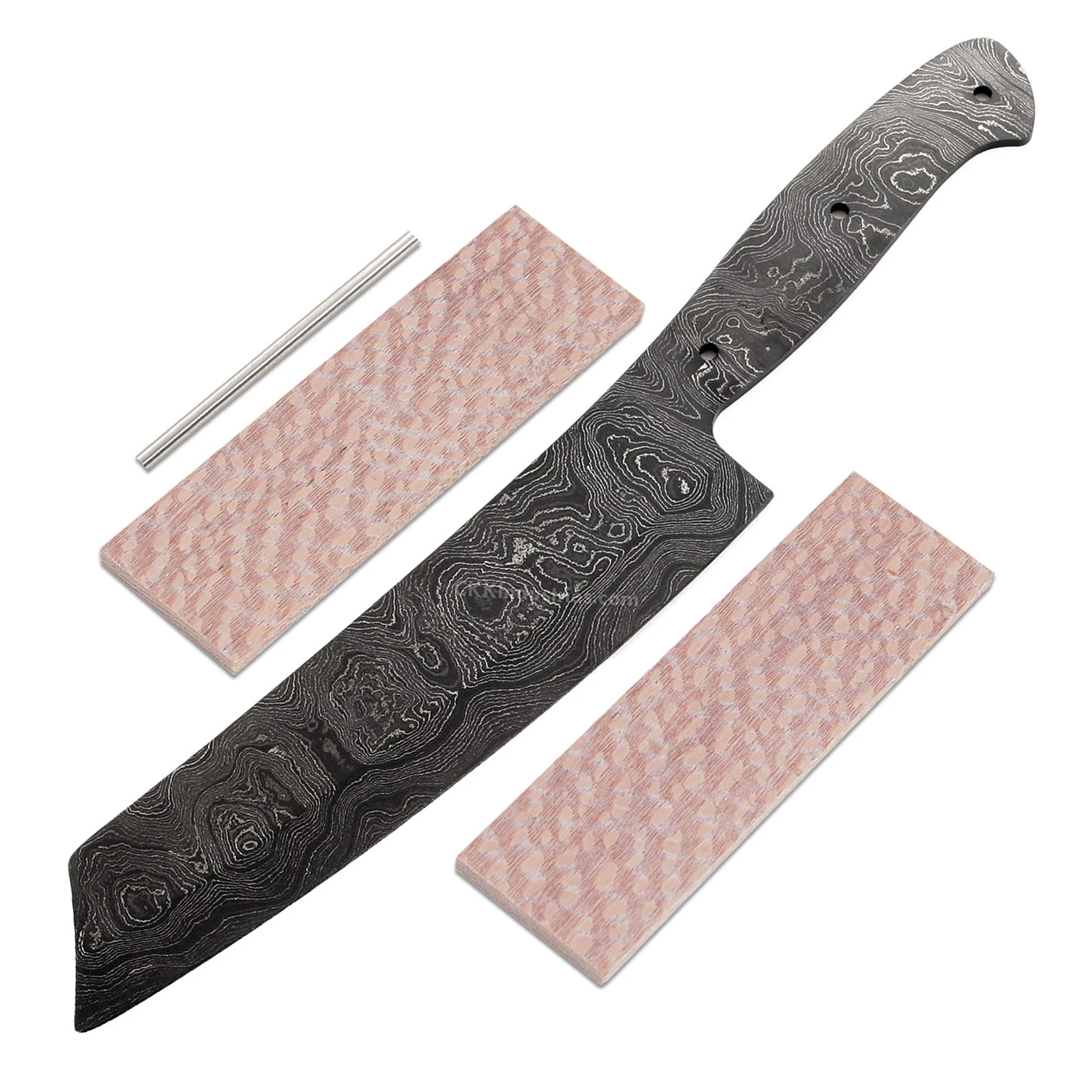 This beautiful damascus Japanese-inspired chef blade blank is called the Gourmet. It is a USA Made carbon steel damascus fixed blade knife blank that is hollow-ground and ready to build. This damascus chef knife making kit model will make a fantastic presentation kitchen knife. It is the perfect gift for the accomplished home chef in your life. With a blade length of 7.375 inches and an overall length of 12.25 inches, this design is perfect for meal preparation. Ground on both sides, the Gourmet’s blade is 1.75 inches wide. This damascus kitchen knife making kit design features (3) 0.156 inch through-holes for handle construction (stainless steel pinstock included). The tang holes can be modified with ease to work with larger pinstock, or with threaded fasteners.