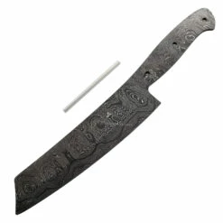 This beautiful damascus Japanese-inspired chef blade blank is called the Gourmet. It is a USA Made carbon steel damascus fixed blade knife blank that is hollow-ground and ready to build. This damascus chef knife making kit model will make a fantastic presentation kitchen knife. It is the perfect gift for the accomplished home chef in your life. With a blade length of 7.375 inches and an overall length of 12.25 inches, this design is perfect for meal preparation. Ground on both sides, the Gourmet’s blade is 1.75 inches wide. This damascus kitchen knife making kit design features (3) 0.156 inch through-holes for handle construction (stainless steel pinstock included). The tang holes can be modified with ease to work with larger pinstock, or with threaded fasteners.
