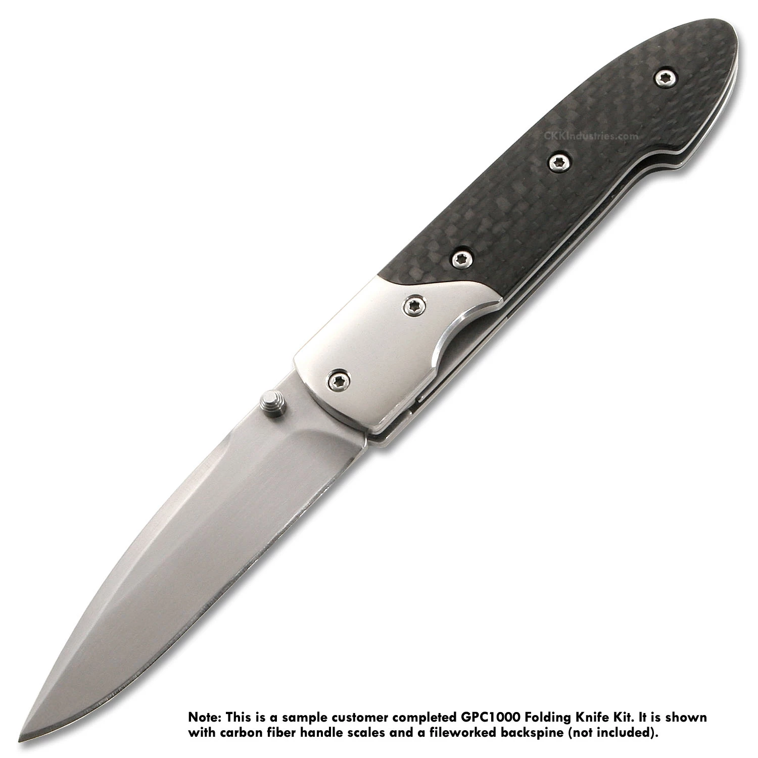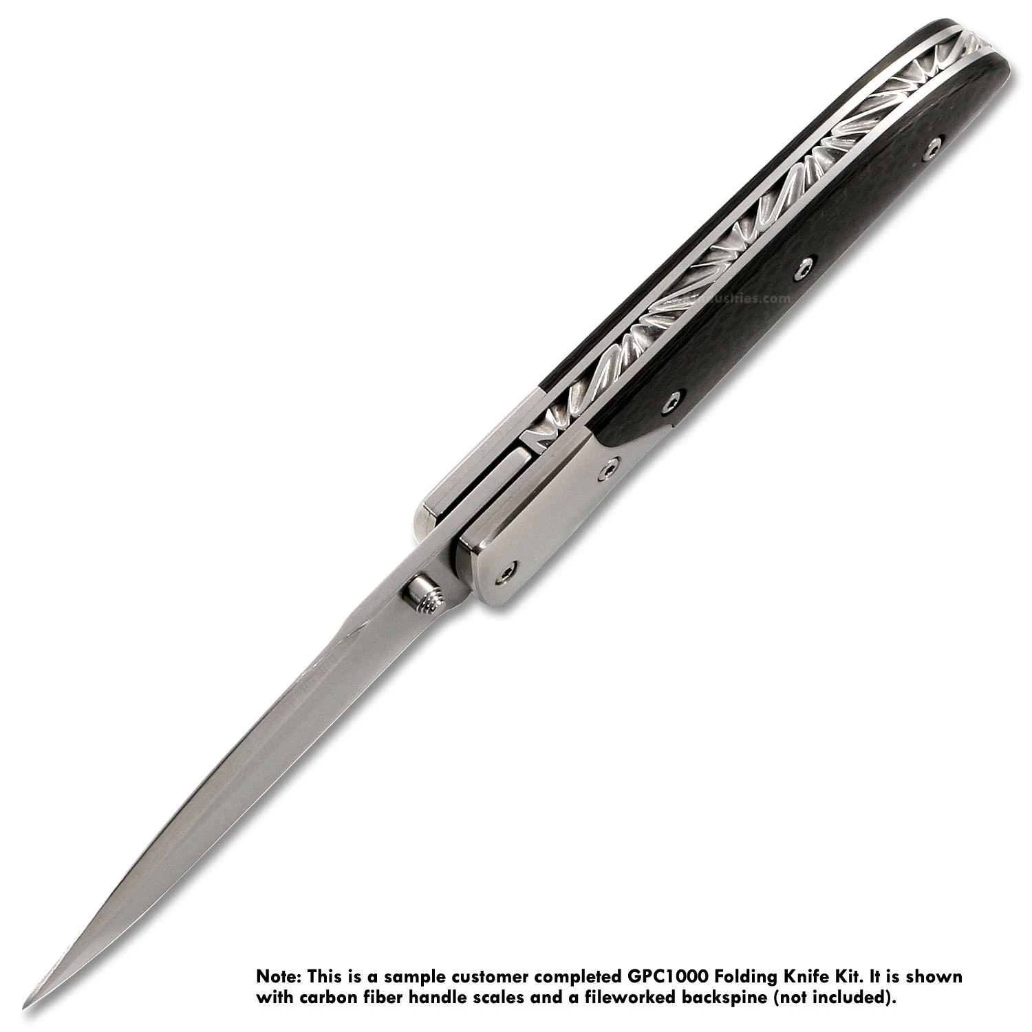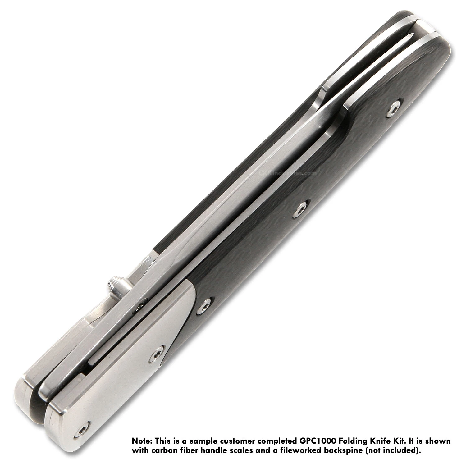 The GPC-1000 (Gent’s Pocket Carry) is a locking liner folding knife kit designed for the hobbyist that likes a sleek, more stylized design. This new pocket knife kit is made of the same high quality components as our other knifekits.com designer series exclusives, but offers the maker the widest choice of modification. It is designed to look good as a “high-tech” piece, with standard micarta, G-10, or carbon fiber scales. Or as a “high-finish” model with materials such as pearl, exotic woods, and with embellishments on the liners and bolsters. This folding knife kit is a premium kit product. All parts and fittings are precision machined. The liners on this pocket knife kit are stainless steel and heat treated. The ball detent is in place, the lock is pre-bent, and the entire assembly has been personally inspected before shipping. The blade steel on the GPC-1000 is AUS-8 and has been cryogenically treated to 56-58 rc. The blade come in standard satin finsh.