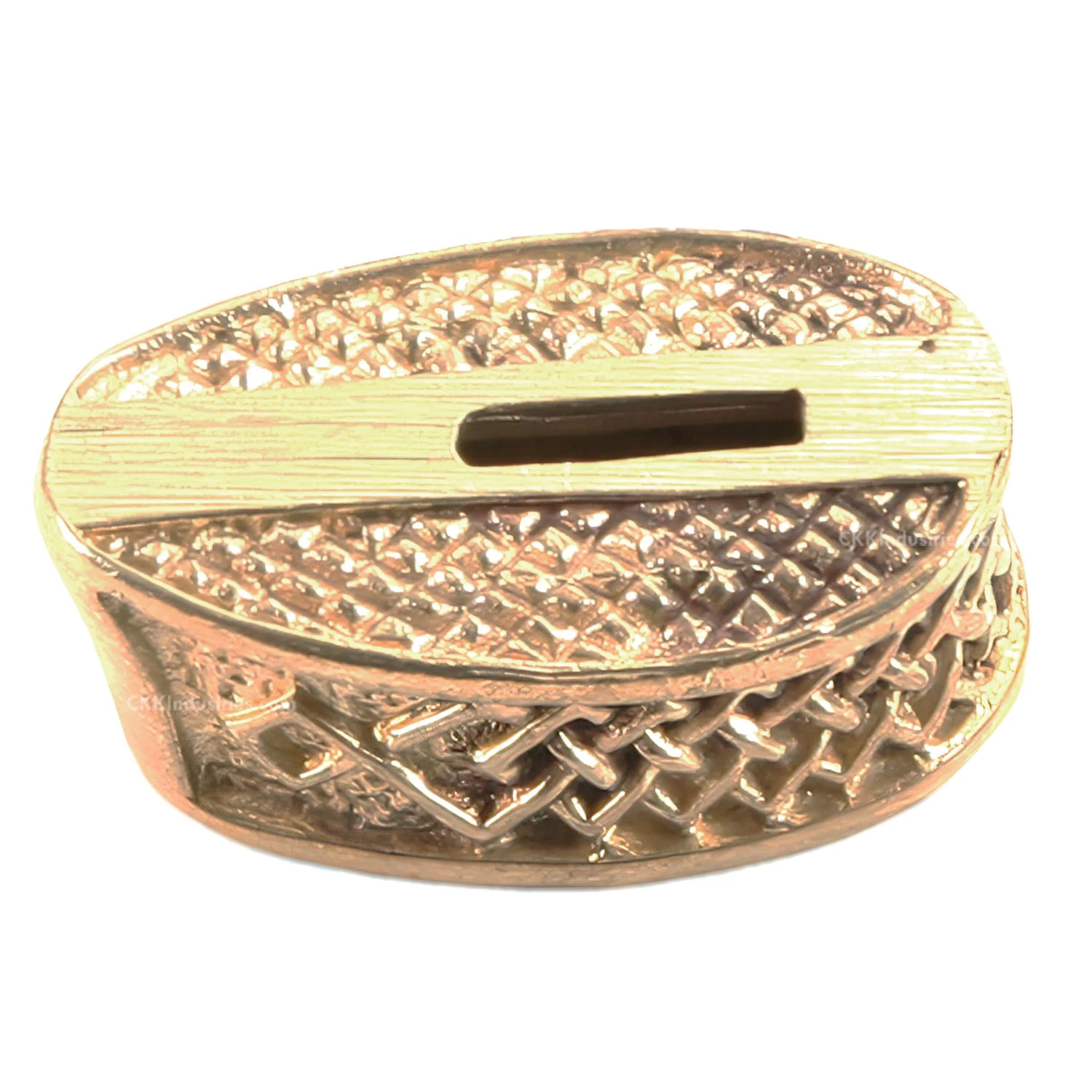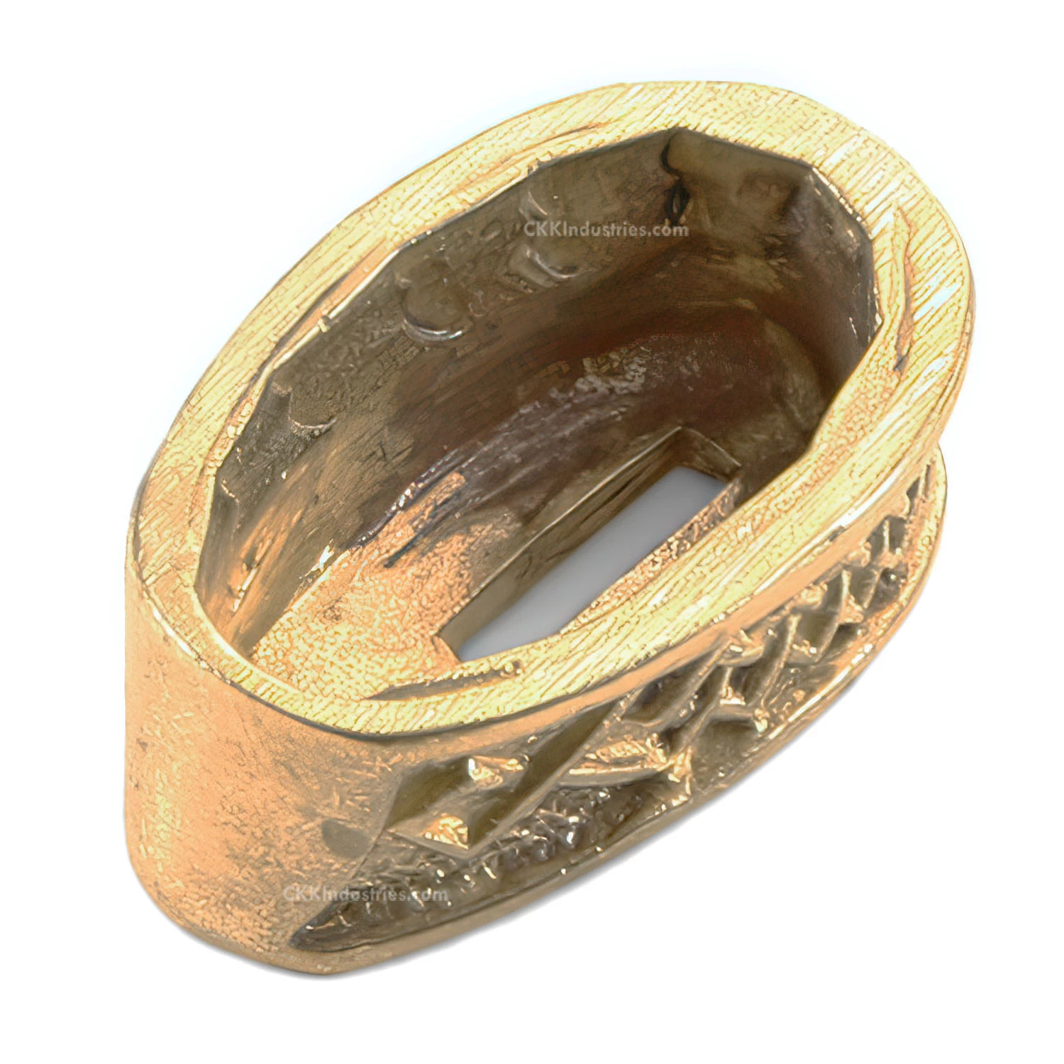 This guard features an engraved top and side surface. The side is engraved with a braided knot and the top face is stippled. It can be adapted to complete a hidden tang custom knife design by slipping over the tang of the knife. This model features a pre-cut slot, which can be easily modified for tang fit, and offers a deep slipover cavity for versatile handle fitting. This is a very high-quality, hand cast part!