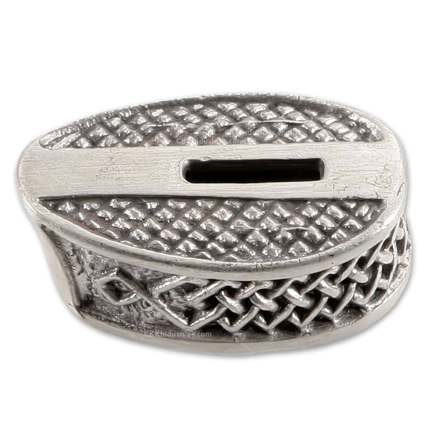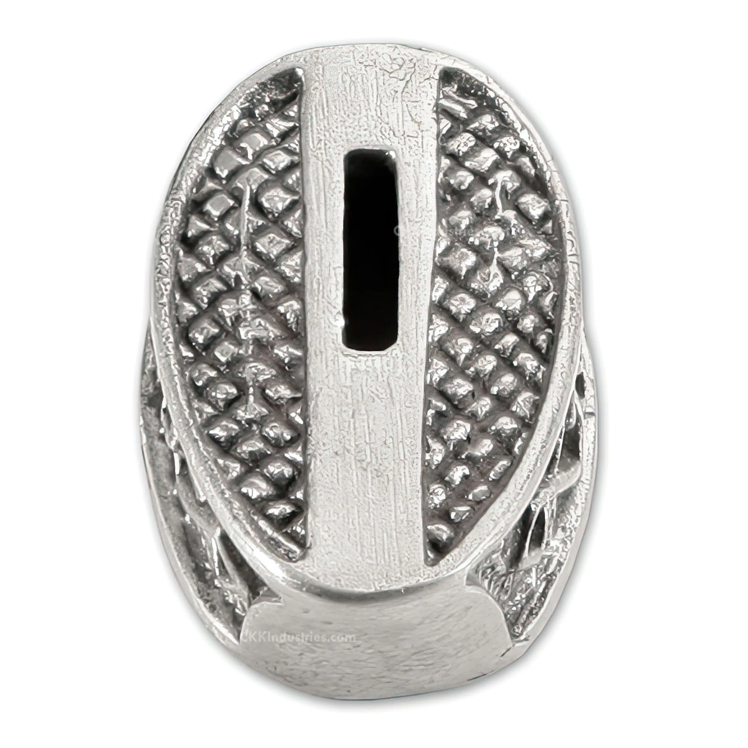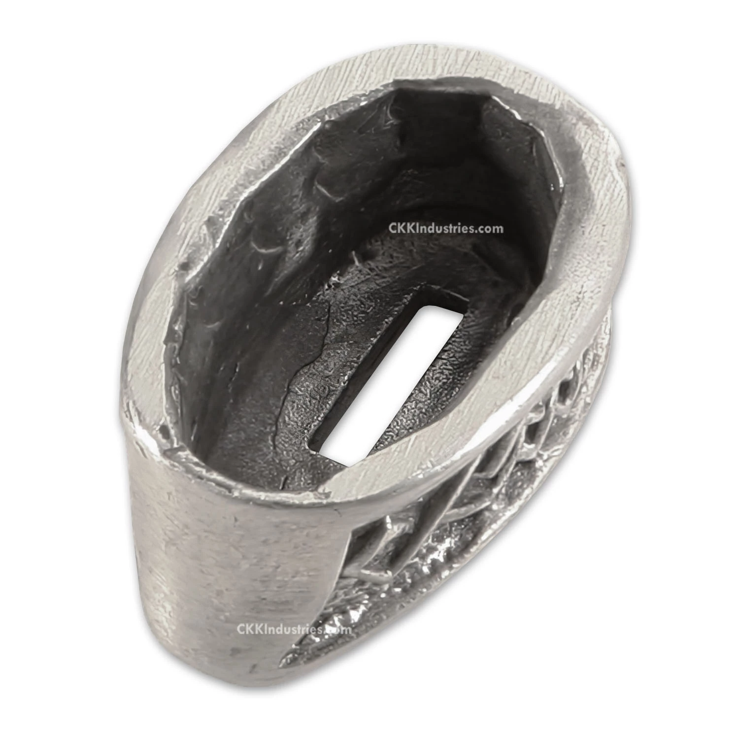 This guard features an engraved top and side surface. The side is engraved with a braided knot and the top face is stippled. It can be adapted to complete a hidden tang custom knife design by slipping over the tang of the knife. This model features a pre-cut slot, which can be easily modified for tang fit, and offers a deep slipover cavity for versatile handle fitting. This is a very high-quality, hand cast part!