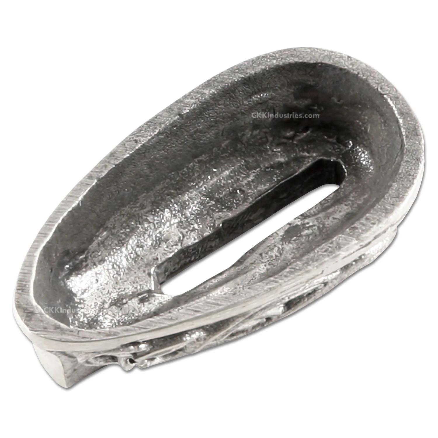 This guard features an engraved top and side surface. It can be adapted to complete a hidden tang custom knife design by slipping over the tang of the knife. This model features a pre-cut slot, which can be easily modified for tang fit, and offers a deep slipover cavity for versatile handle fitting. This is a very high-quality, hand cast part!