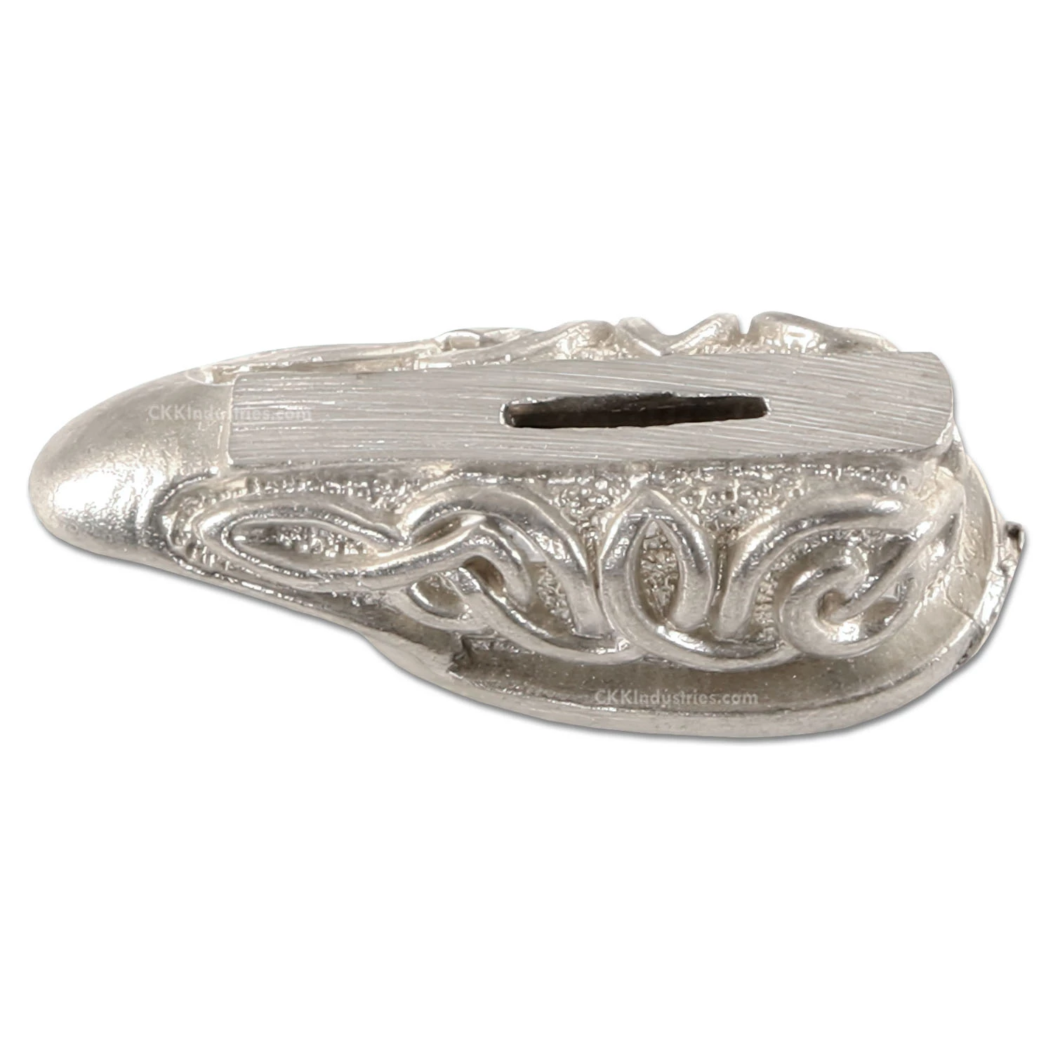 This guard features an engraved side surface. The side is engraved with a braided knot and the top face is stippled. It can be adapted to complete a hidden tang custom knife design by slipping over the tang of the knife. This model features a pre-cut slot, which can be easily modified for tang fit, and offers a deep slipover cavity for versatile handle fitting. This is a very high-quality, hand cast part!
