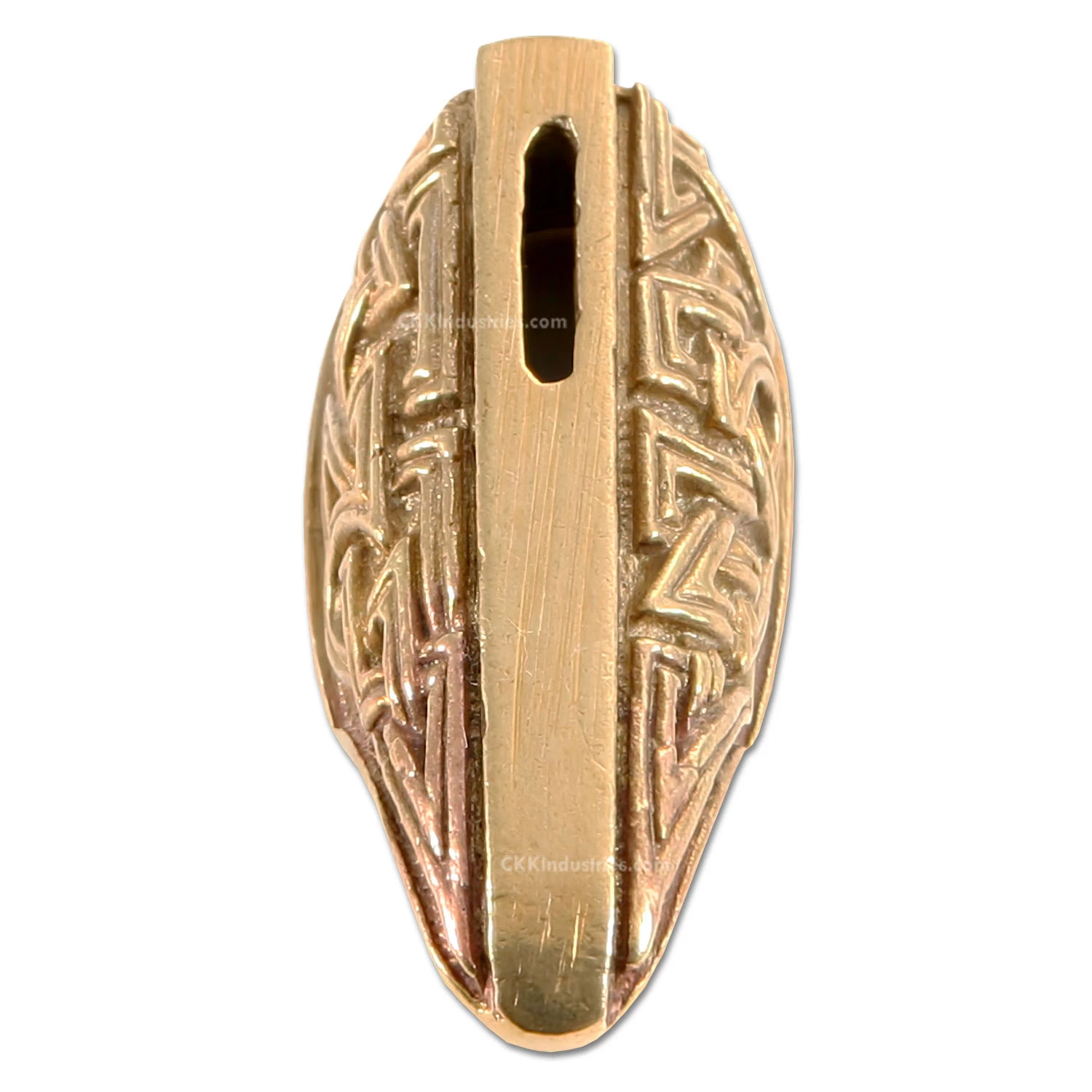 This guard features an engraved top and side surface. The side is engraved with a celtic knot and the top face is stippled. It can be adapted to complete a hidden tang custom knife design by slipping over the tang of the knife. This model features a pre-cut slot, which can be easily modified for tang fit, and offers a deep slipover cavity for versatile handle fitting. This is a very high-quality, hand cast part!