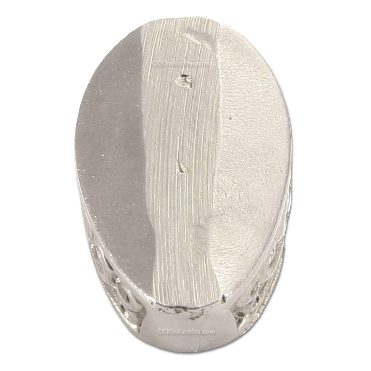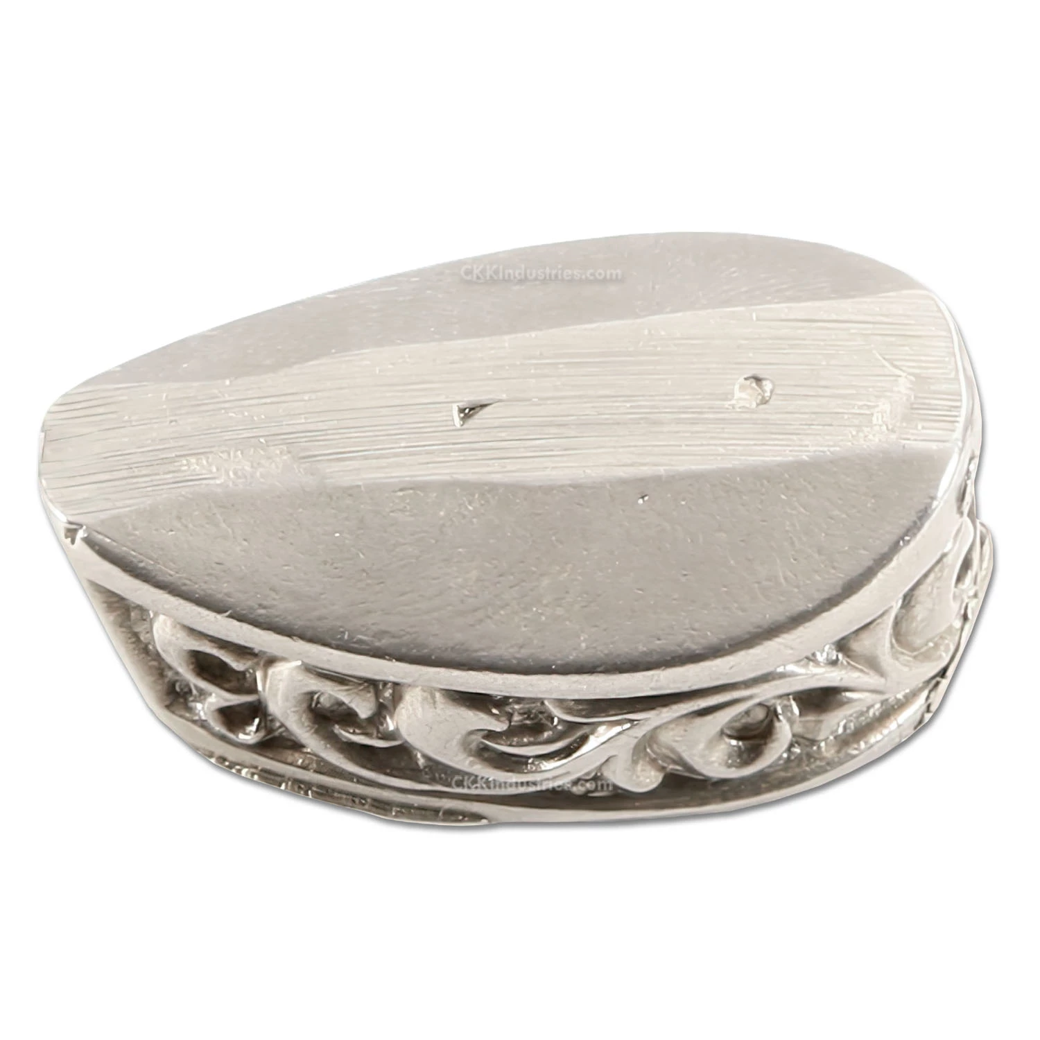 This guard features an engraved top and side surface. The side is engraved with a celtic knot and the top face is stippled. It can be adapted to complete a hidden tang custom knife design by slipping over the tang of the knife. This model allows you to create your own slot , which can be easily modified for tang fit, and offers a deep slipover cavity for versatile handle fitting. This is a very high-quality, hand cast part!