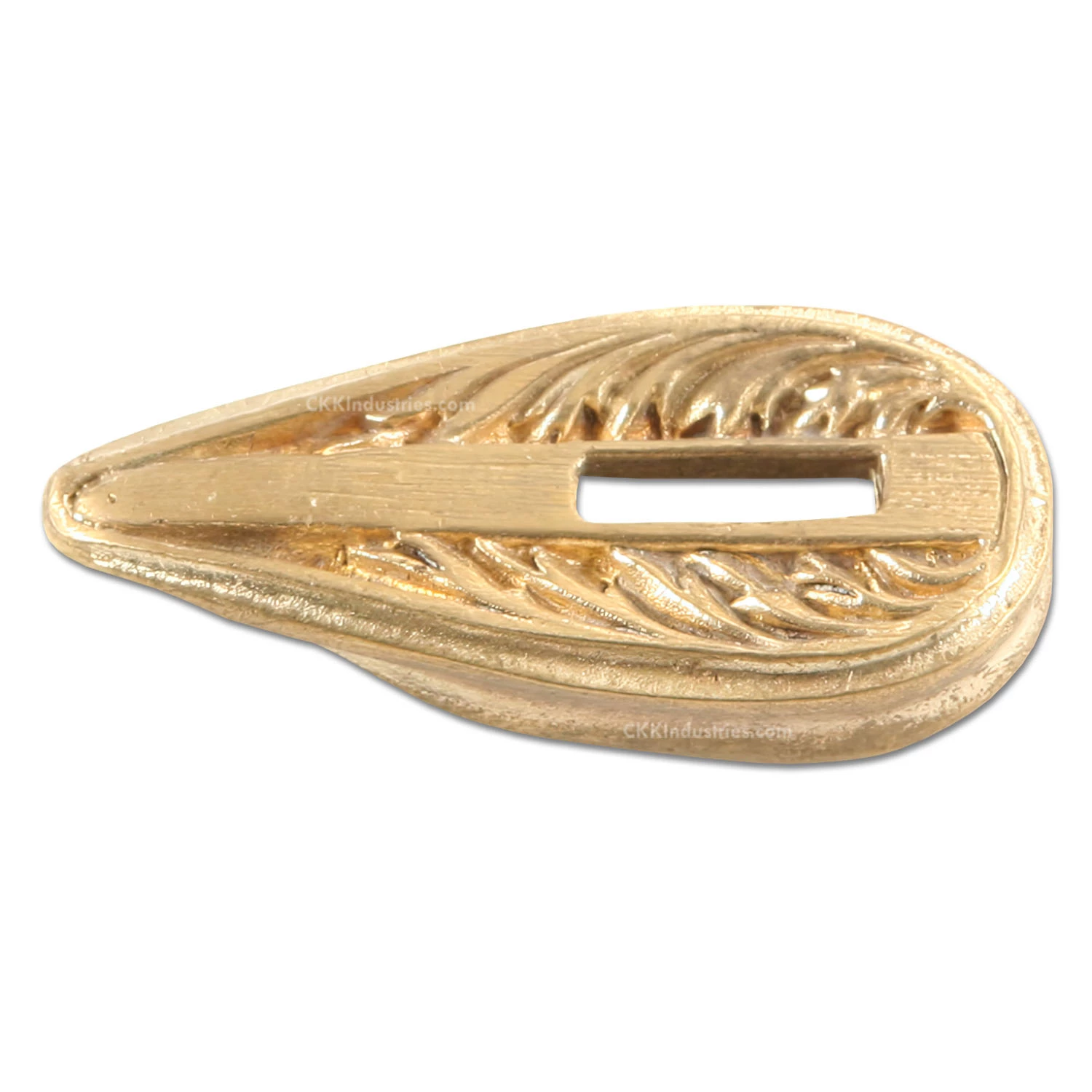 This guard features an engraved top surface. The surface is engraved with a feather design. It can be adapted to complete a hidden tang custom knife design by slipping over the tang of the knife. This model features a pre-cut slot, which can be easily modified for tang fit, and offers a deep slipover cavity for versatile handle fitting. This is a very high-quality, hand cast part!