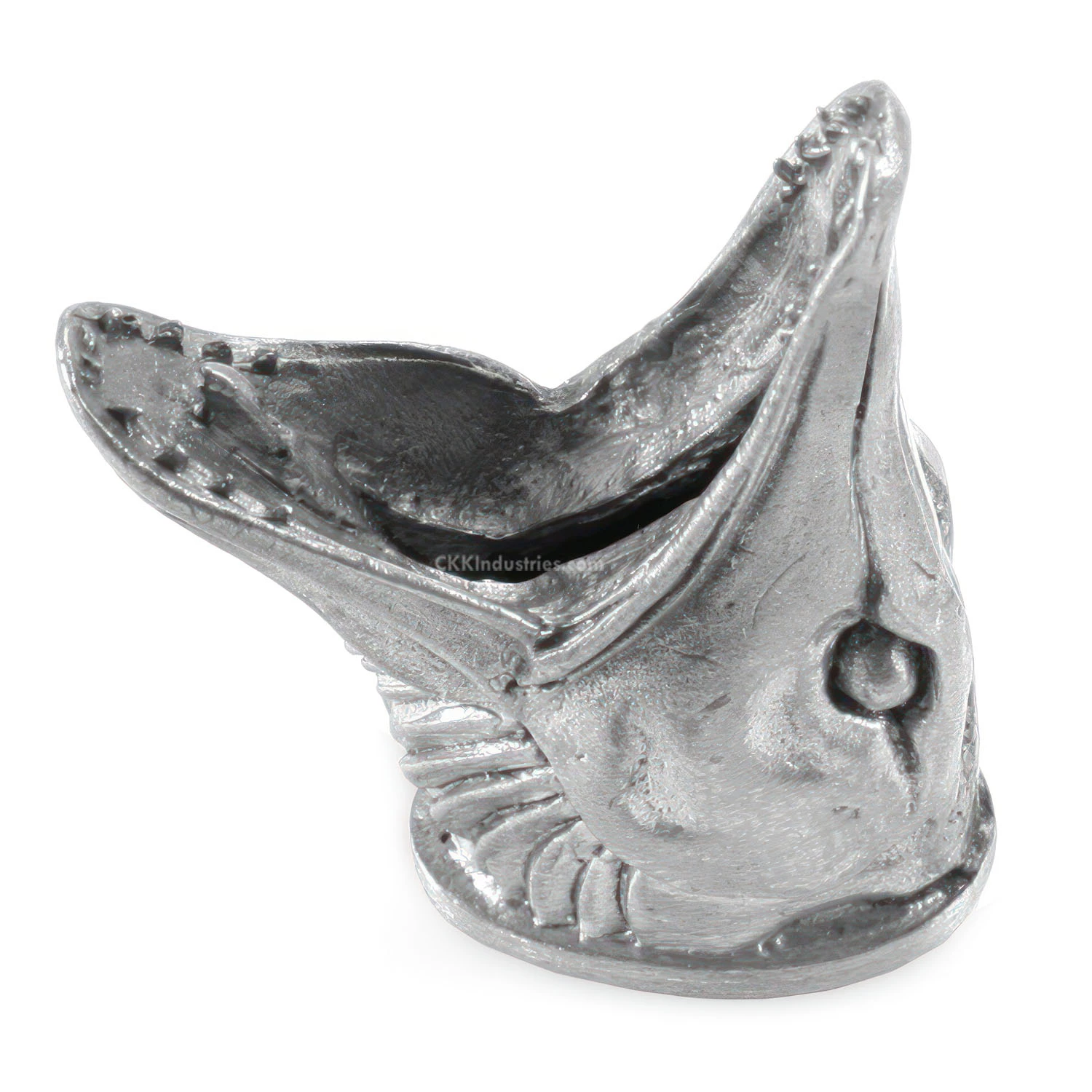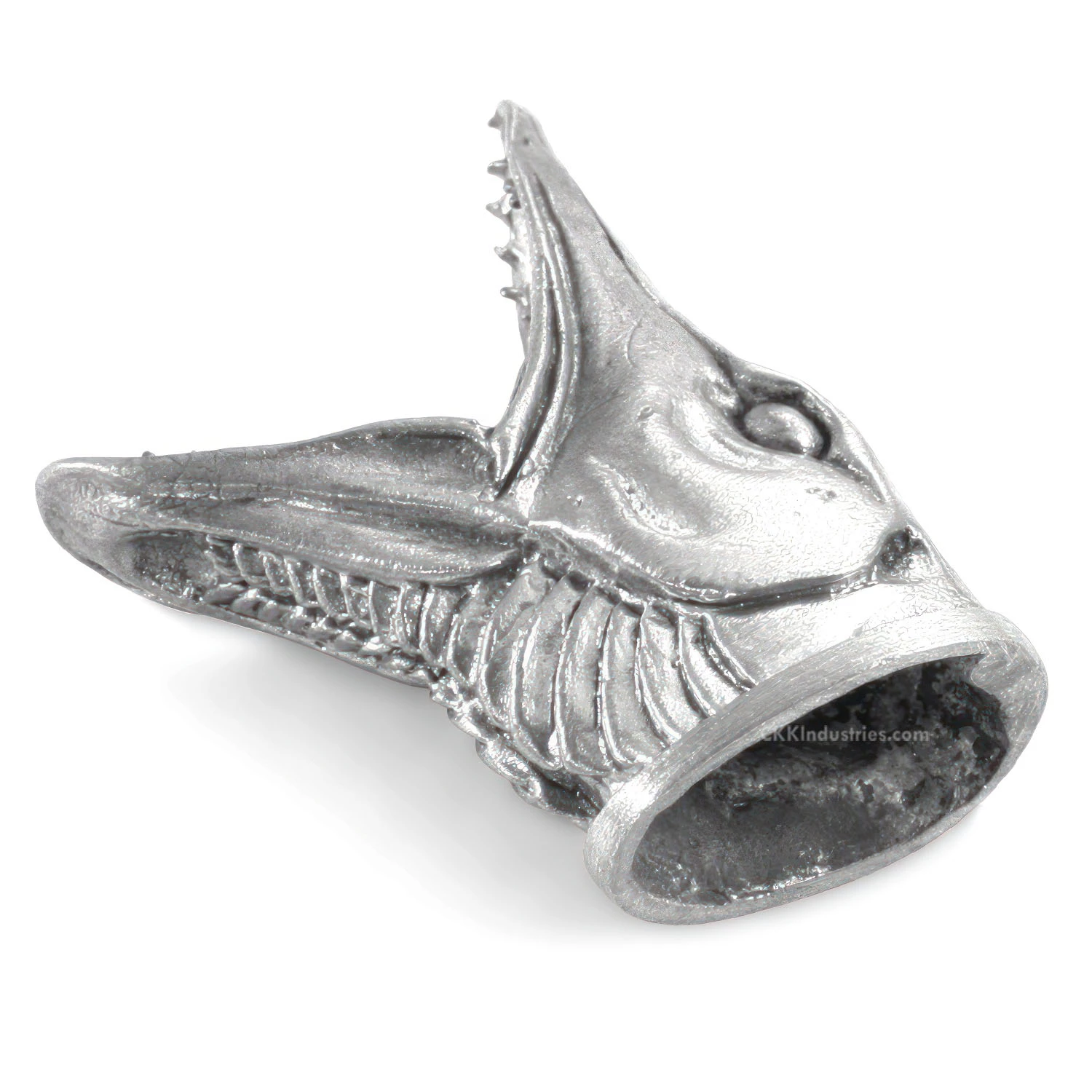 This guard features an open-mouth Pike head design that will command attention. It can be adapted to complete a hidden tang custom knife design by slipping over the tang of the knife. This model features a pre-cut slot, which can be easily modified for tang fit. This guard offers a deep slipover cavity for versatile handle fitting. This is a very high-quality, hand cast part!