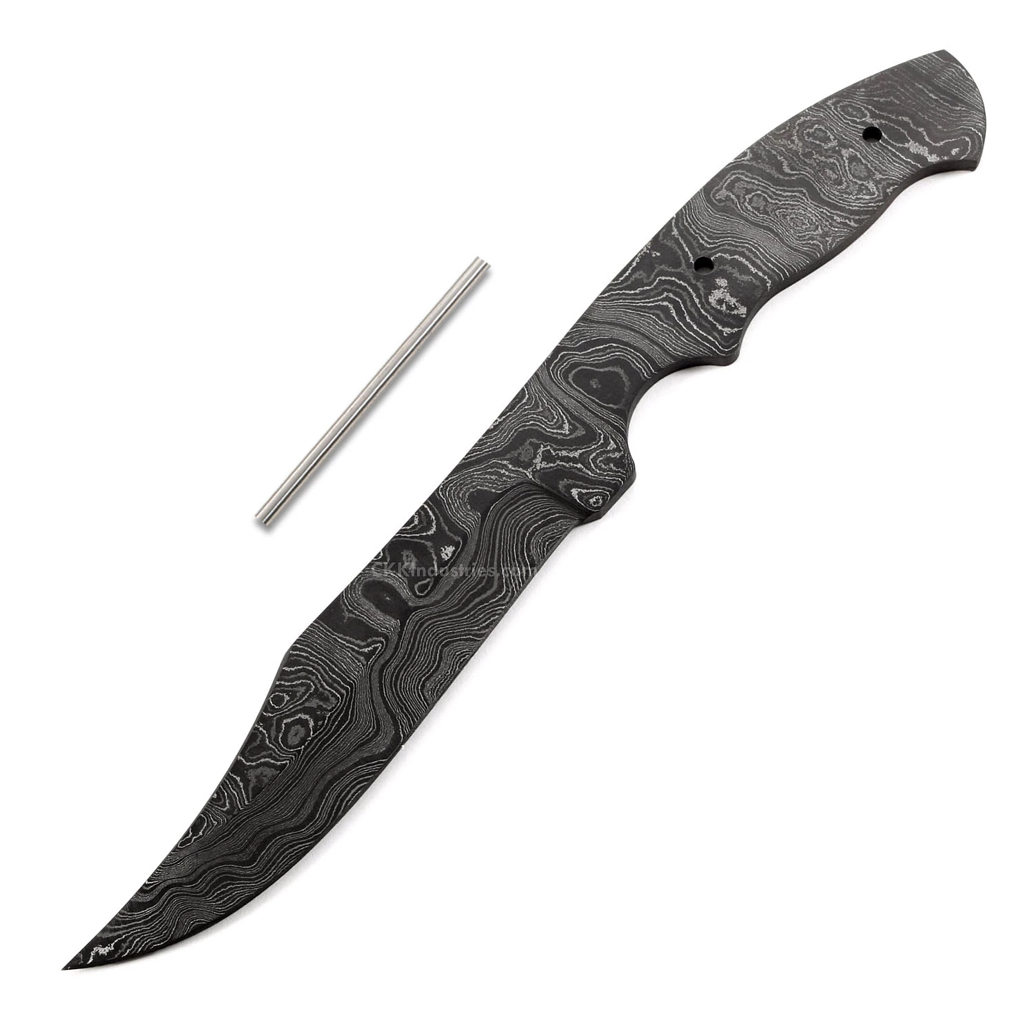 This damascus trailing point blade blank design is called the “Gunslinger”. It is a USA Made carbon steel damascus fixed blade knife blank that is hollow-ground and ready to build. This damascus trailing point knife blank model has a medium-large size and commands attention. The Gunslinger has a blade length of 5.00 inches and an overall length of 7.875 inches. Ground on both sides, the blade is 1.187 inches wide. This damascus blade blank design features (2) 0.187 inch through-holes for handle construction (stainless steel pinstock included). The tang holes can be modified with ease to work with larger pinstock, or with threaded fasteners.