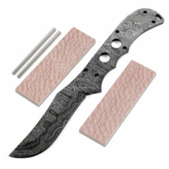 This damascus trailing point knife kit design is called the “Highland”. It is a USA Made carbon steel damascus fixed blade knife blank that is hollow-ground and ready to build. This damascus trailing point blade blank model will make a fantastic personal hunter or skinning knife, or will serve very well as a collectible gift project. With a blade length of 3.375 inches and an overall length of 8.875 inches, this design is a perfect carry size. Ground on both sides, the Highland’s blade is 1.00 inches wide with a 0.160 inch thickness. This damascus hunting knife blank design features (6) 0.156 inch through-holes for handle construction (stainless steel pinstock included). The tang holes can be modified with ease to work with larger pinstock, or with threaded fasteners. Please see our parts and handle fasteners sections for more options. This version of the Highland is the combo kit. It comes with the Highland blade plus Lacewood handle scales and stainless steel pinstock to simplify the completion process. This is a great project for a weekend knife making session. Spend some quality workshop time with this skinning knife kit and enjoy the fun of custom knife making and customization.
