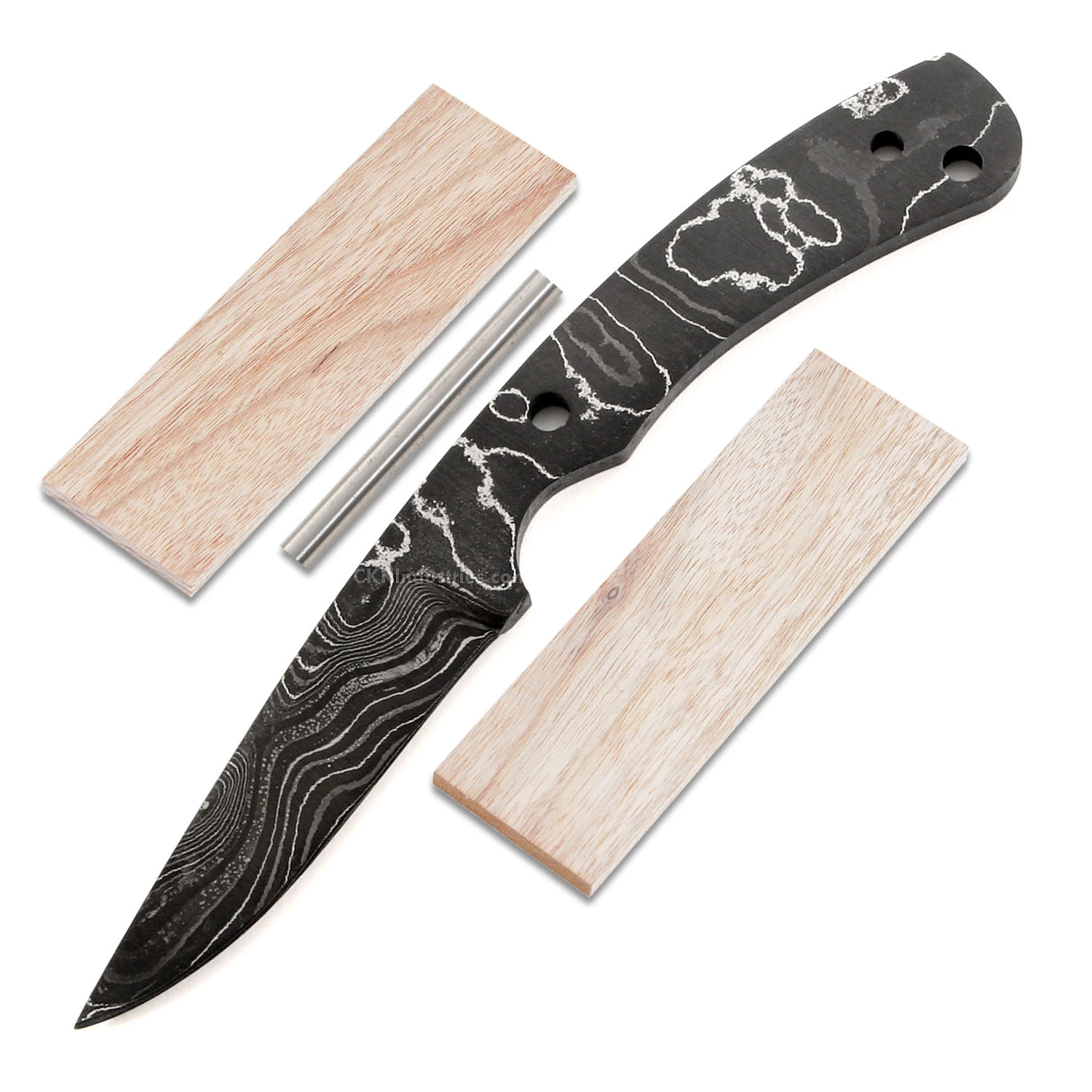 This carry-sized damascus drop point knife kit design is called the “Hornet”. It is a USA Made carbon steel damascus fixed blade knife blank that is hollow-ground and ready to build. This damascus drop point blade blank model is small enough to hideaway, and will make a fantastic personal carry knife. It will also serve very well as a collectible gift project. With a blade length of 2.75 inches and an overall length of 6.56 inches, this design is a perfect carry size. Ground on both sides, the Hornet’s blade is 0.75 inches wide with a .150 inch thickness. This damascus drop point knife kit design features (2) 0.187 inch through-holes for handle construction (stainless steel pinstock included) with a 0.156 inch thong hole for an optional lanyard, if desired. The tang holes can be modified with ease to work with larger pinstock, or with threaded fasteners.
