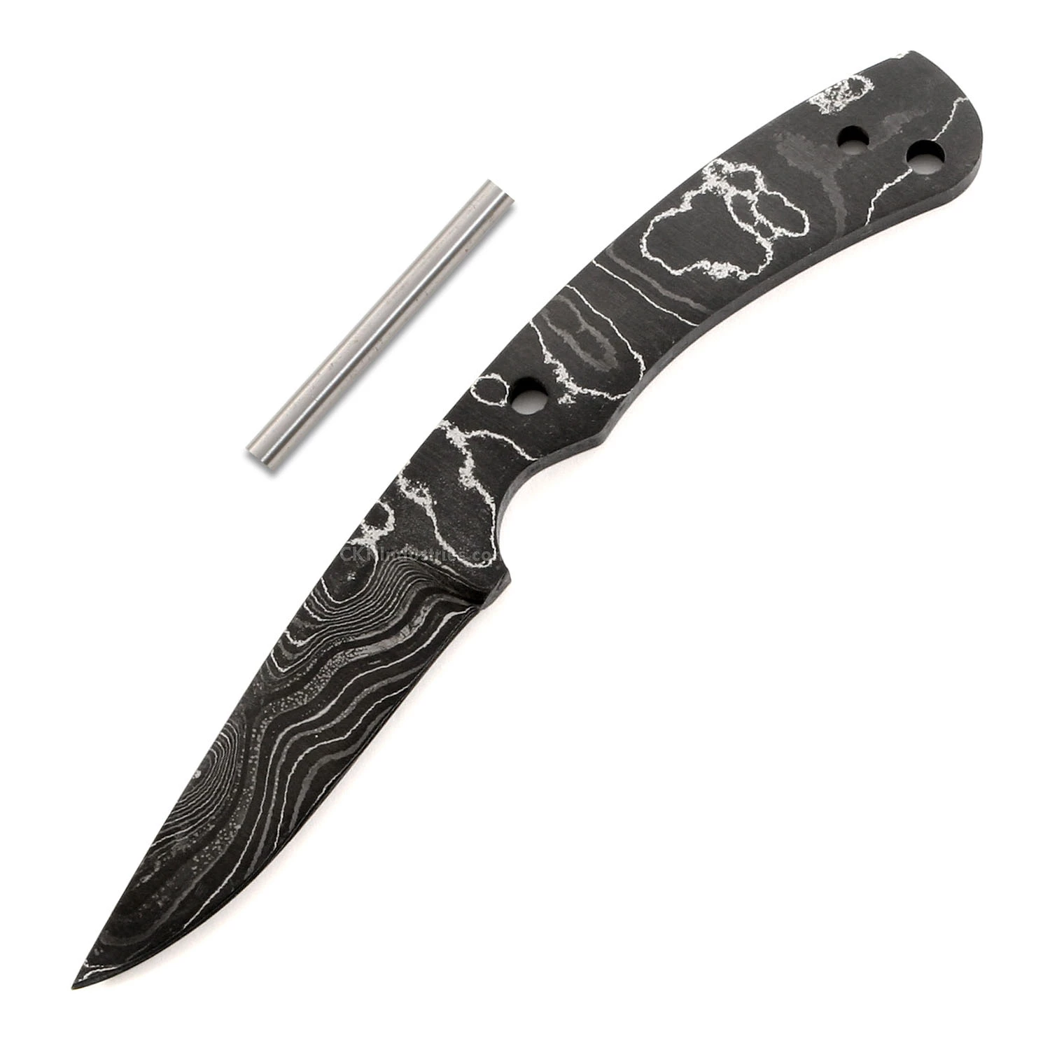 This carry-sized damascus drop point knife kit design is called the “Hornet”. It is a USA Made carbon steel damascus fixed blade knife blank that is hollow-ground and ready to build. This damascus drop point blade blank model is small enough to hideaway, and will make a fantastic personal carry knife. It will also serve very well as a collectible gift project. With a blade length of 2.75 inches and an overall length of 6.56 inches, this design is a perfect carry size. Ground on both sides, the Hornet’s blade is 0.75 inches wide with a .150 inch thickness. This damascus drop point knife kit design features (2) 0.187 inch through-holes for handle construction (stainless steel pinstock included) with a 0.156 inch thong hole for an optional lanyard, if desired. The tang holes can be modified with ease to work with larger pinstock, or with threaded fasteners.