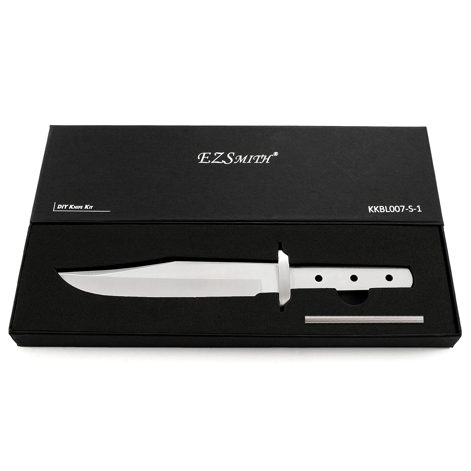 The blade length on the HT Boot Bowie is 5.75 inches and the thickness is 0.145 inches. It comes hollow ground, satin-finished, and has a guard attached. This is a great hidden tang knife kit and is a fun, affordable and simple project to complete. The hidden tang has (3) pre-drilled .01875 inch inch through-holes for handle placement (stainless steel pinstock included).
