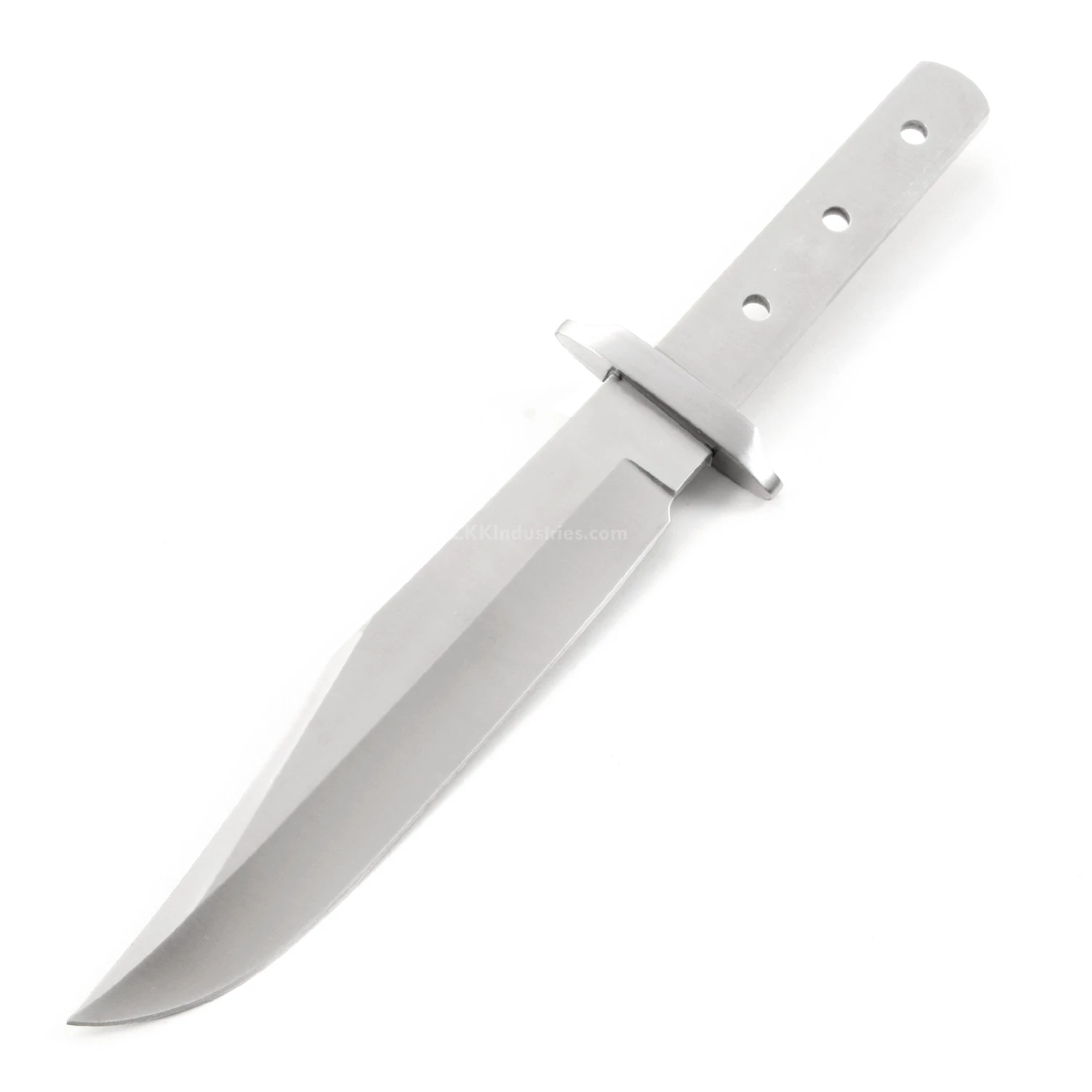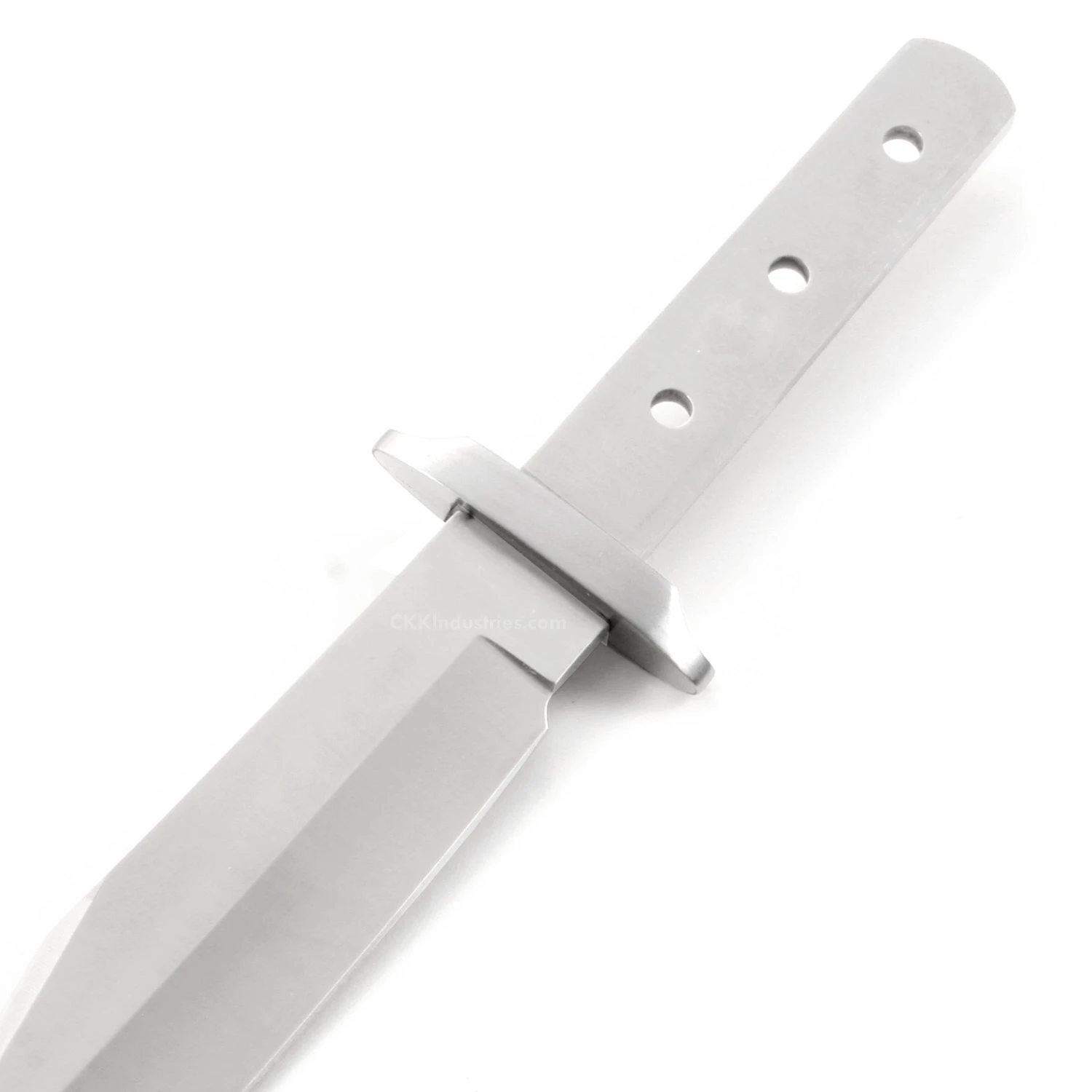 The blade length on the HT Boot Bowie is 5.75 inches and the thickness is 0.145 inches. It comes hollow ground, satin-finished, and has a guard attached. This is a great hidden tang knife kit and is a fun, affordable and simple project to complete. The hidden tang has (3) pre-drilled .01875 inch inch through-holes for handle placement (stainless steel pinstock included).
