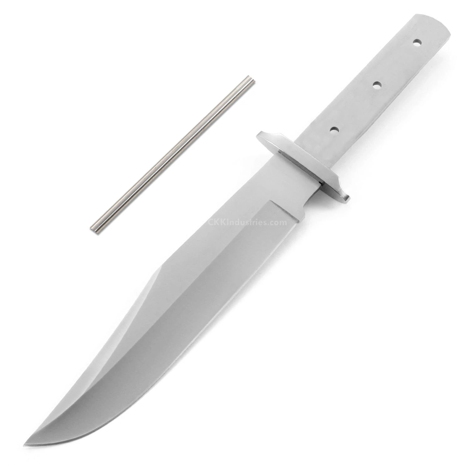 The blade length on the HT Saddle Bowie is 7.875 inches and the thickness is 0.160 inches. It comes hollow-ground, satin-finished, and has a finger guard attached. This hidden tang bowie knife design is a fun, affordable, and simple project to complete. The hidden tang has (3) pre-drilled 0.1875 inch through-holes in it for handle attachment (stainless steel pinstock included).