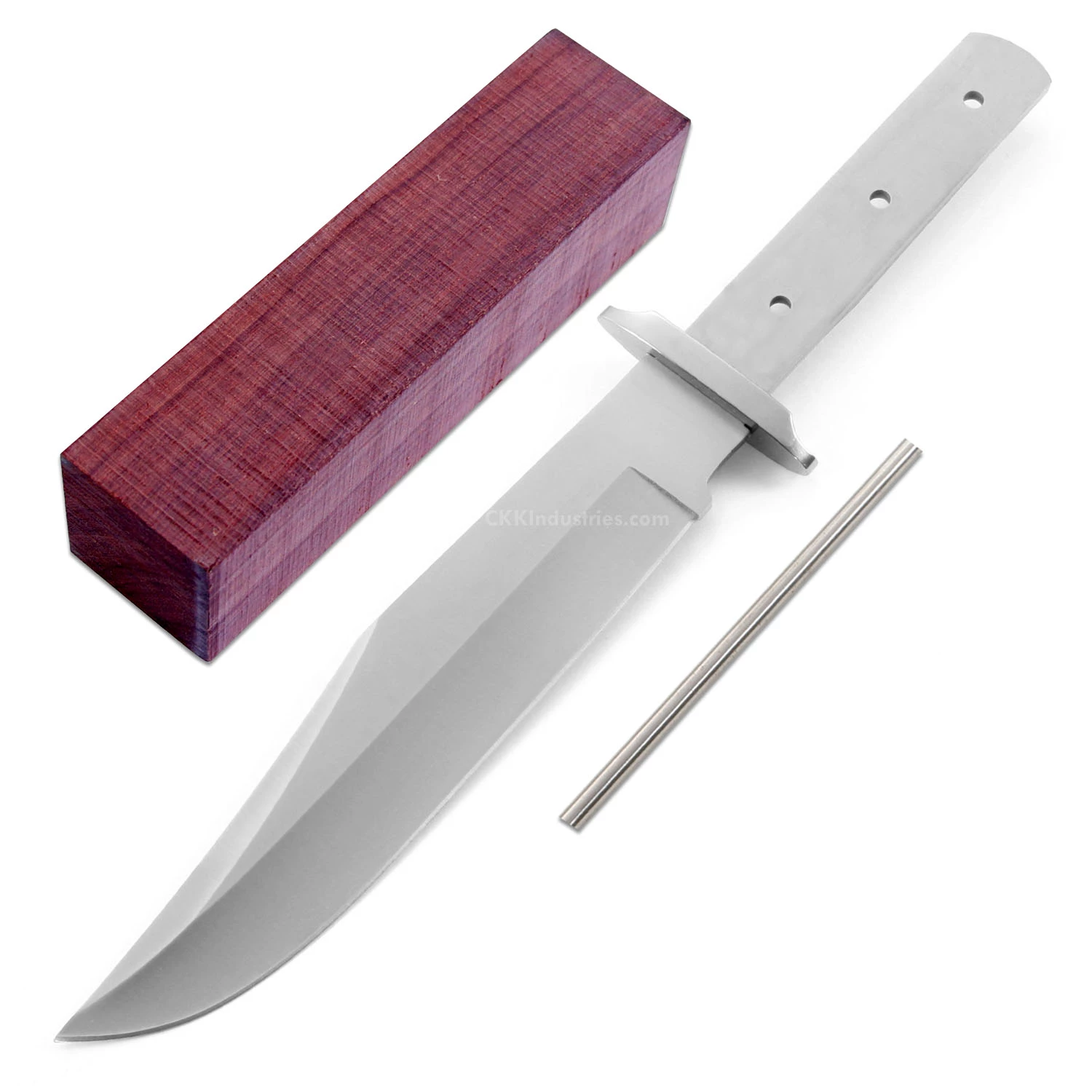 This version of the HT Saddle Bowie is the combo kit. It comes with the HT Saddle Bowie, guard, stainless steel pinstock, and a premium block of Katalox handle material to simplify the completion process. This is a great project blade for a weekend knife making session. Spend some quality workshop time with this excellent hidden tang knife kit and enjoy the fun of custom knife making and customization.