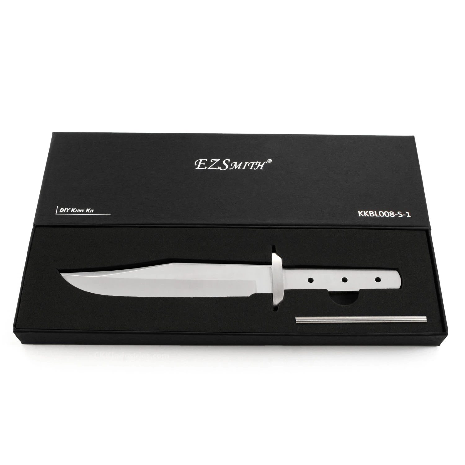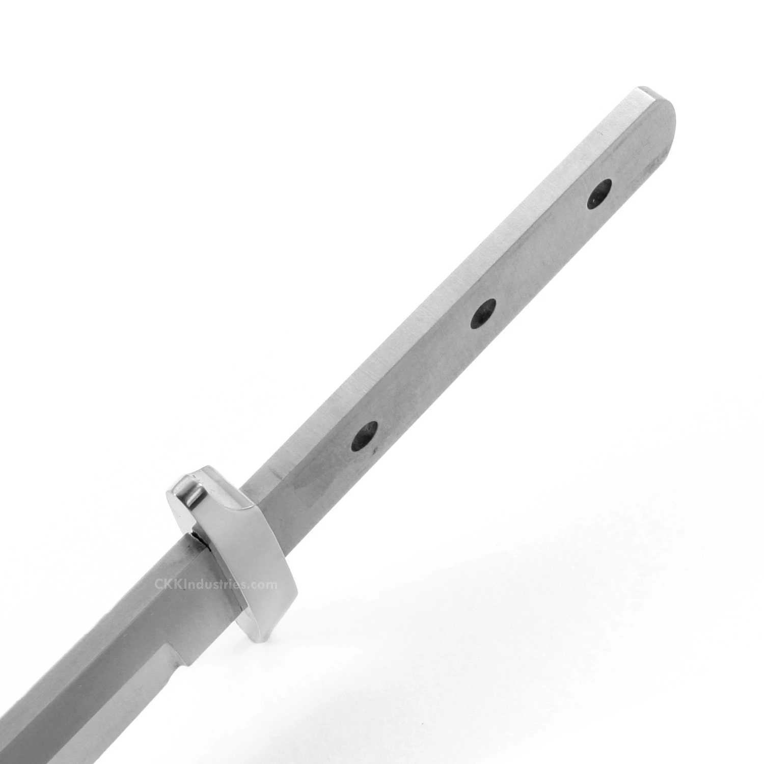The HT Saddle Bowie knife kit is a great project for someone who wants a larger camp sized bowie with a dress 416SS (engravable) guard. It is designed to fit a slip-over handle and can be finished with 3 pin placement options. This is a great hidden tang bowie blade blank design project for that favorite large stag antler you’ve been saving. With the Bowie inspired design, you get a great cutting grind with a highly tested survival tip. The blade is made from 440C stainless and the pre-pinned guard is made from 416 stainless steel. The blade length on the HT Saddle Bowie is 7.875 inches and the thickness is 0.160 inches. It comes hollow-ground, satin-finished, and has a finger guard attached. This hidden tang bowie knife design is a fun, affordable, and simple project to complete. The hidden tang has (3) pre-drilled 0.1875 inch through-holes in it for handle attachment (stainless steel pinstock included).