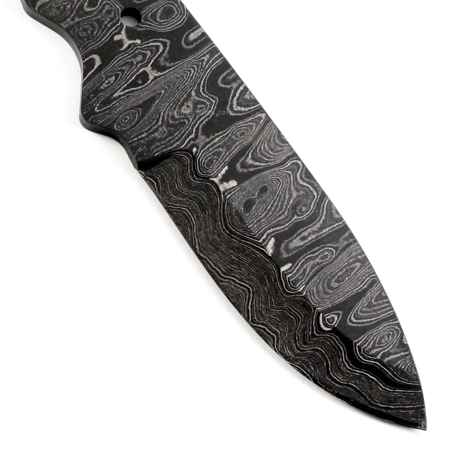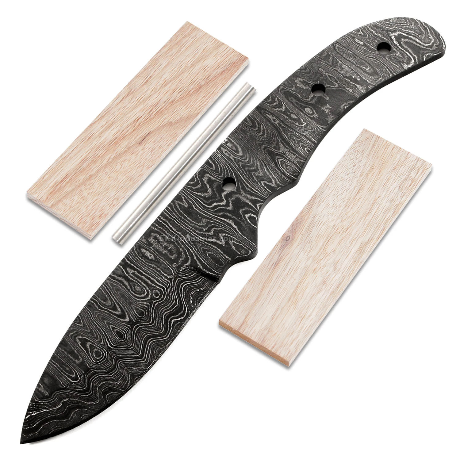 This damascus hunting knife making kit design is called the “Huntsman”. It is a USA Made carbon steel damascus fixed blade knife blank that is hollow-ground and ready to build. This damascus blade blank model will make a fantastic personal hunting knife. The Huntsman has a blade length of 3 inches and an overall length of 8 inches. Ground on both sides, the blade is 1-1/4″ wide. This damascus hunting blade blank design features (3) .187″ through-holes for handle construction (stainless steel pinstock included). The tang holes can be modified with ease to work with larger pinstock, or with threaded fasteners if desired. This version is the combo kit. It comes with the Huntsman blade blank, handle pinstock, plus Canarywood handle scales to simplify the completion process. The Huntsman’s tang holes can be modified with ease to work with larger pinstock or threaded fasteners, if desired. Please see our handle fastener parts and handle mounting tools sections for more options.