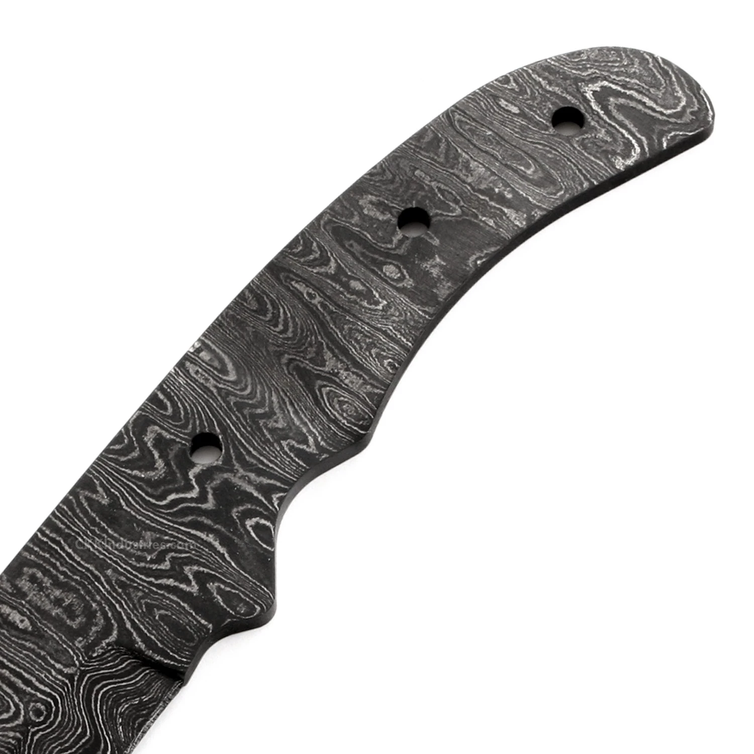 This damascus hunting knife making kit design is called the “Huntsman”. It is a USA Made carbon steel damascus fixed blade knife blank that is hollow-ground and ready to build. This damascus blade blank model will make a fantastic personal hunting knife. The Huntsman has a blade length of 3 inches and an overall length of 8 inches. Ground on both sides, the blade is 1-1/4″ wide. This damascus hunting blade blank design features (3) .187″ through-holes for handle construction (stainless steel pinstock included). The tang holes can be modified with ease to work with larger pinstock, or with threaded fasteners if desired. This version is the combo kit. It comes with the Huntsman blade blank, handle pinstock, plus Walnut handle scales to simplify the completion process. The Huntsman’s tang holes can be modified with ease to work with larger pinstock or threaded fasteners, if desired. Please see our handle fastener parts and handle mounting tools sections for more options.