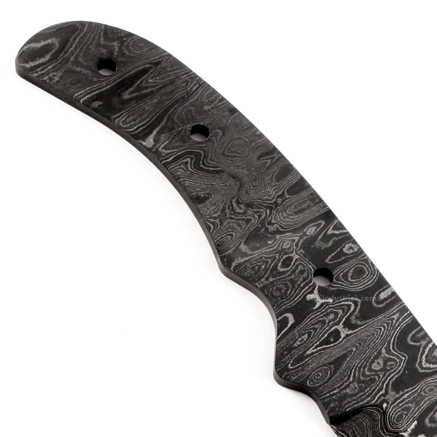 This damascus hunting knife making kit design is called the “Huntsman”. It is a USA Made carbon steel damascus fixed blade knife blank that is hollow-ground and ready to build. This damascus blade blank model will make a fantastic personal hunting knife. The Huntsman has a blade length of 3 inches and an overall length of 8 inches. Ground on both sides, the blade is 1-1/4″ wide. This damascus hunting blade blank design features (3) .187″ through-holes for handle construction (stainless steel pinstock included). The tang holes can be modified with ease to work with larger pinstock, or with threaded fasteners if desired. This version is the combo kit. It comes with the Huntsman blade blank, handle pinstock, plus Yellowheart handle scales to simplify the completion process. The Huntsman’s tang holes can be modified with ease to work with larger pinstock or threaded fasteners, if desired. Please see our handle fastener parts and handle mounting tools sections for more options.