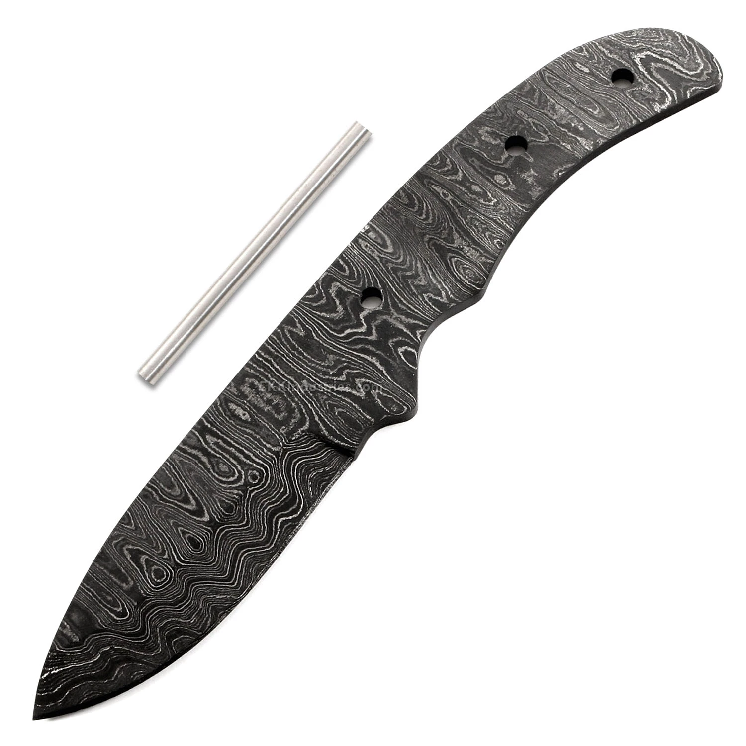 This damascus hunting knife making kit design is called the “Huntsman”. It is a USA Made carbon steel damascus fixed blade knife blank that is hollow-ground and ready to build. This damascus blade blank model will make a fantastic personal hunting knife. The Huntsman has a blade length of 3 inches and an overall length of 8 inches. Ground on both sides, the blade is 1-1/4″ wide. This damascus hunting blade blank design features (3) .187″ through-holes for handle construction (stainless steel pinstock included). The tang holes can be modified with ease to work with larger pinstock, or with threaded fasteners if desired.