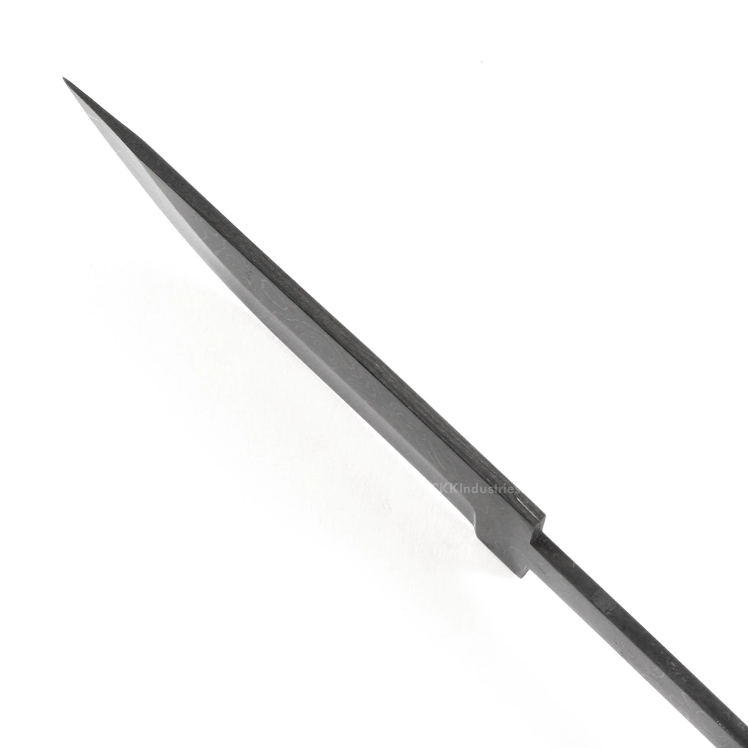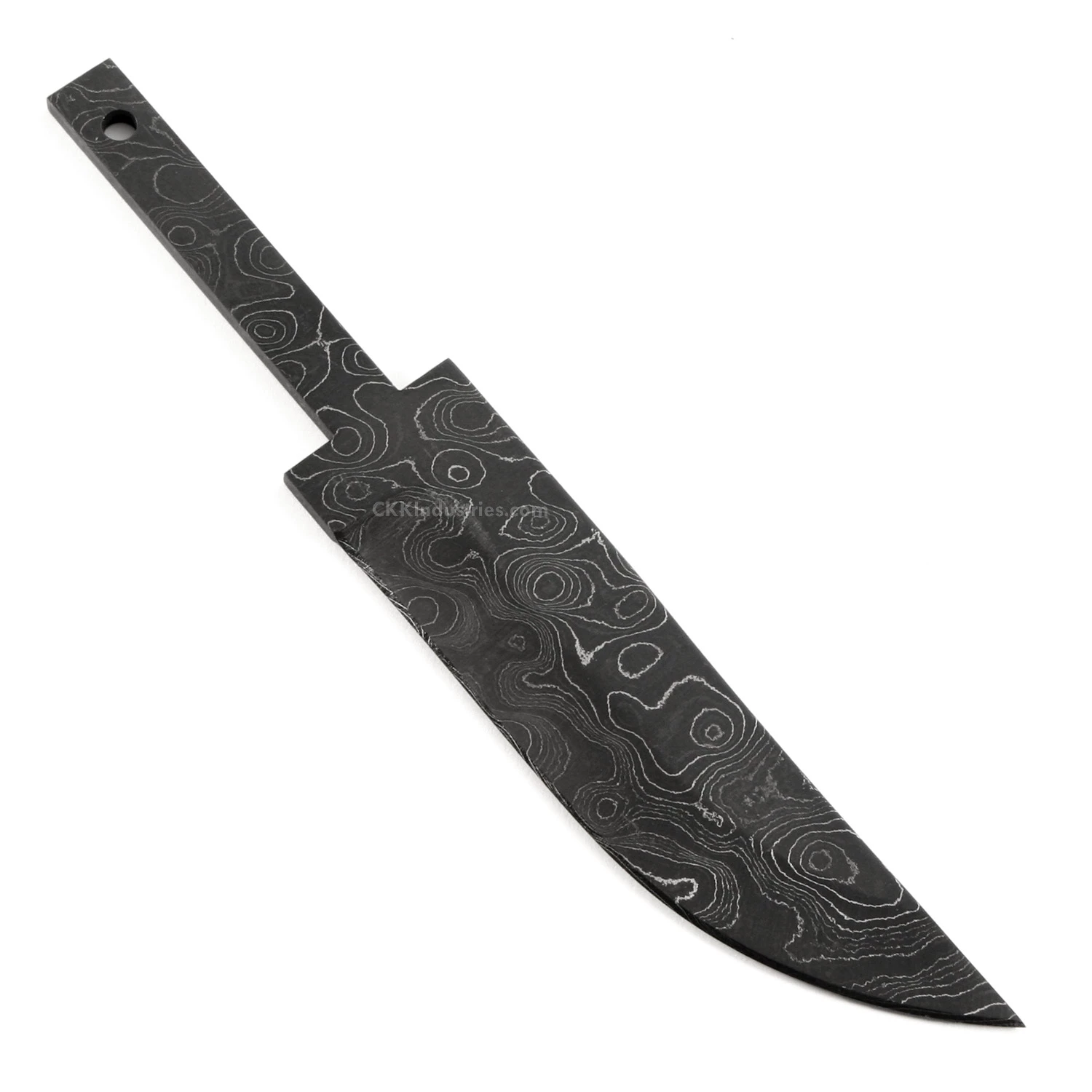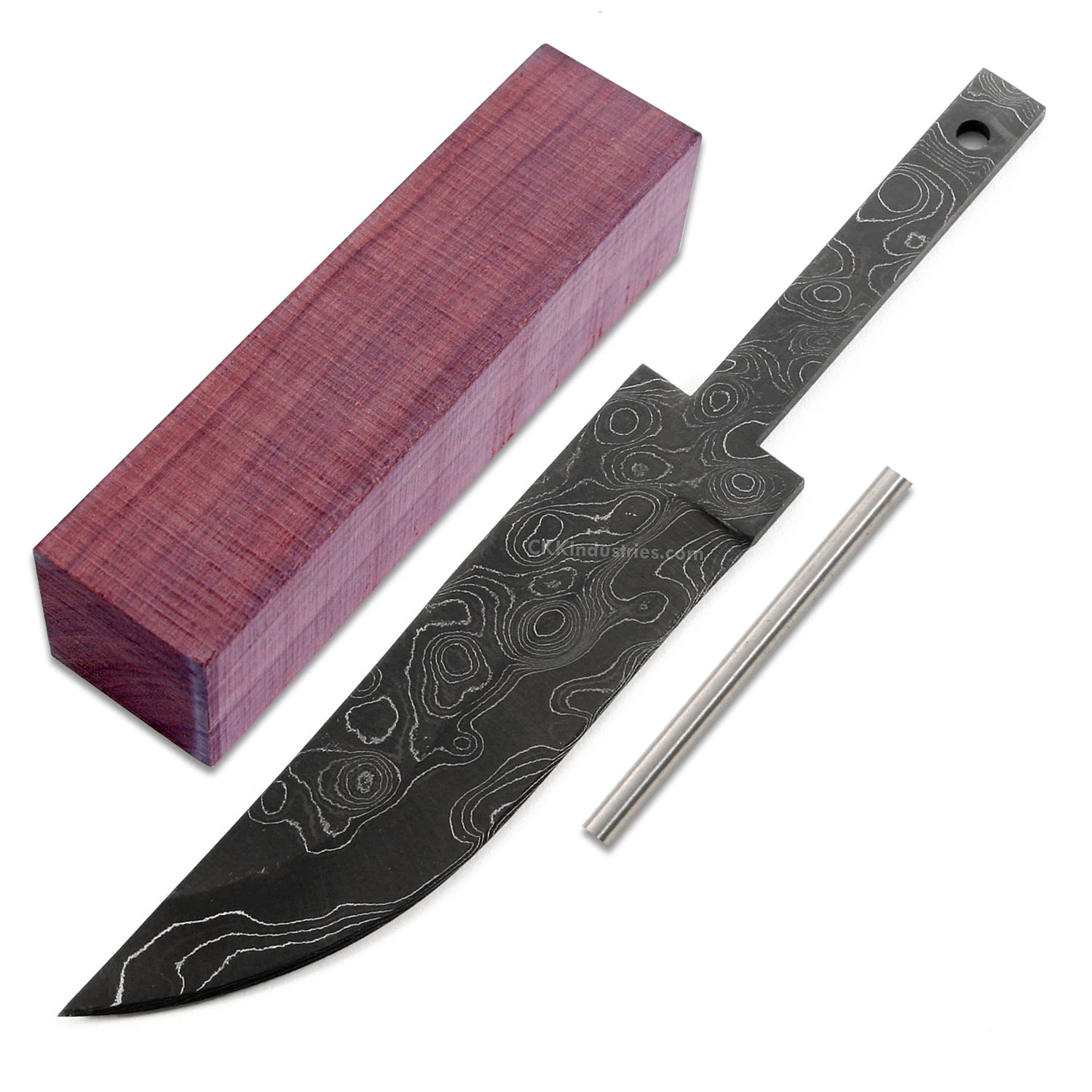 This damascus hidden tang blade kit design is called the “Jackal”. It is a USA Made carbon steel damascus fixed blade knife blank that is hollow-ground and ready to build. This damascus hidden tang knife kit will make a great personal knife for the DIY builder. It is expertly designed, and well made. With a blade length of 4.625 inches and an overall length of 7.25 inches, this design is a perfect carry size. Hollow-ground on both sides, the Jackal’s blade is 1.125 inches wide. This damascus knife blank design features (1) 0.187 inch through-hole for handle construction (stainless steel pinstock included). The tang hole can be modified with ease to work with larger pinstock, or with a threaded fastener.