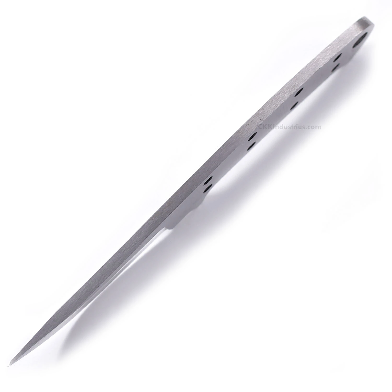 This hand-sized full tang knife kit design is called “Jim Dandy”. It is a USA Made 1075 high carbon steel fixed blade knife blank that is hollow-ground and ready to build. This full tang blade blank model is small enough to “hideaway”, and makes a fantastic personal carry knife. It will also serve very well as a collectible gift project. The Jim Dandy trailing point knife kit has a blade length of 2.75 inches and an overall length of 6.25 inches. Ground on both sides, the blade is 0.75 inches wide. This full tang knife kit design features (8) 0.125 inch through-holes for handle construction (stainless steel pinstock included) with a 0.250 inch thong hole for an optional lanyard. The tang holes on this model can be modified with ease to work with larger pinstock, or with threaded fasteners.