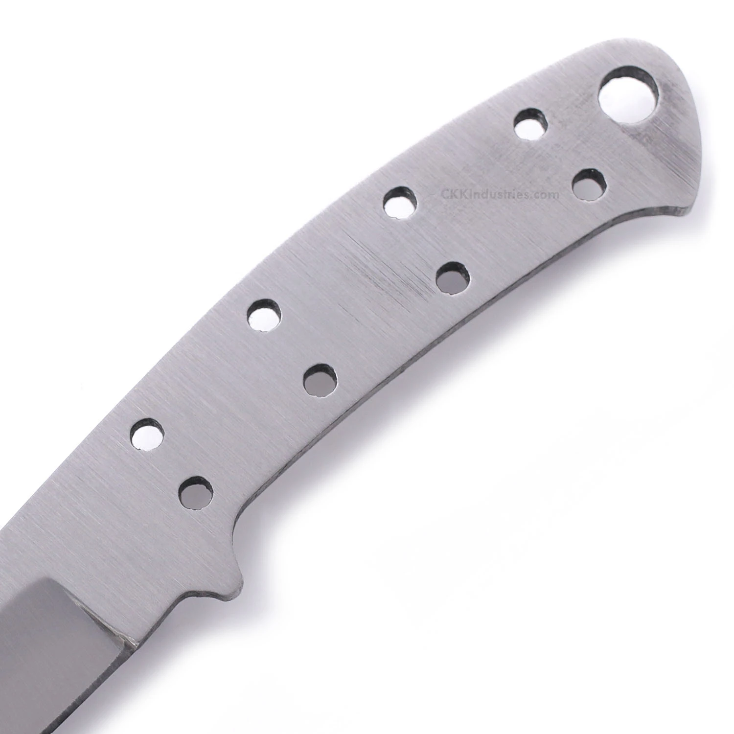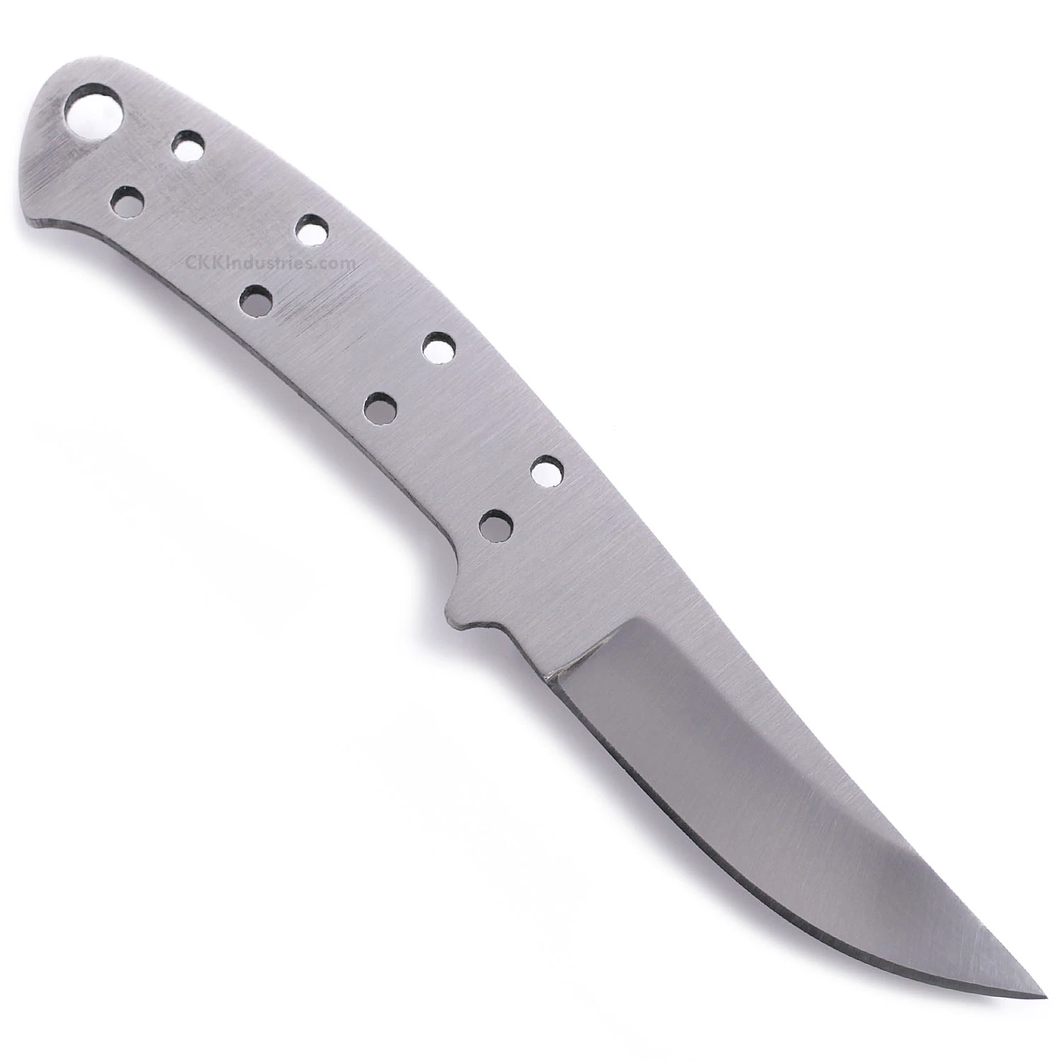 This hand-sized full tang knife kit design is called “Jim Dandy”. It is a USA Made 1075 high carbon steel fixed blade knife blank that is hollow-ground and ready to build. This full tang blade blank model is small enough to “hideaway”, and makes a fantastic personal carry knife. It will also serve very well as a collectible gift project. The Jim Dandy trailing point knife kit has a blade length of 2.75 inches and an overall length of 6.25 inches. Ground on both sides, the blade is 0.75 inches wide. This full tang knife kit design features (8) 0.125 inch through-holes for handle construction (stainless steel pinstock included) with a 0.250 inch thong hole for an optional lanyard. The tang holes on this model can be modified with ease to work with larger pinstock, or with threaded fasteners.