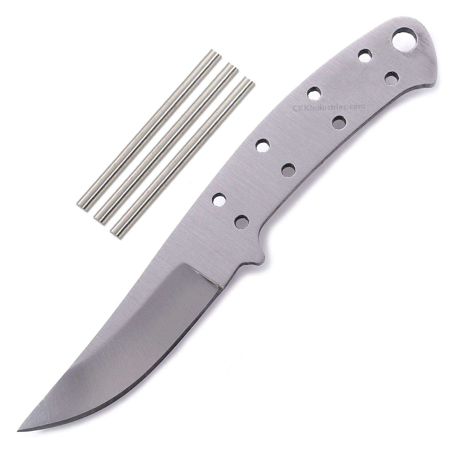 This hand-sized full tang knife kit design is called “Jim Dandy”. It is a USA Made 1075 high carbon steel fixed blade knife blank that is hollow-ground and ready to build. This full tang blade blank model is small enough to “hideaway”, and makes a fantastic personal carry knife. It will also serve very well as a collectible gift project. The Jim Dandy trailing point knife kit has a blade length of 2.75 inches and an overall length of 6.25 inches. Ground on both sides, the blade is 0.75 inches wide. This full tang knife kit design features (8) 0.125 inch through-holes for handle construction (stainless steel pinstock included) with a 0.250 inch thong hole for an optional lanyard. The tang holes on this model can be modified with ease to work with larger pinstock, or with threaded fasteners.