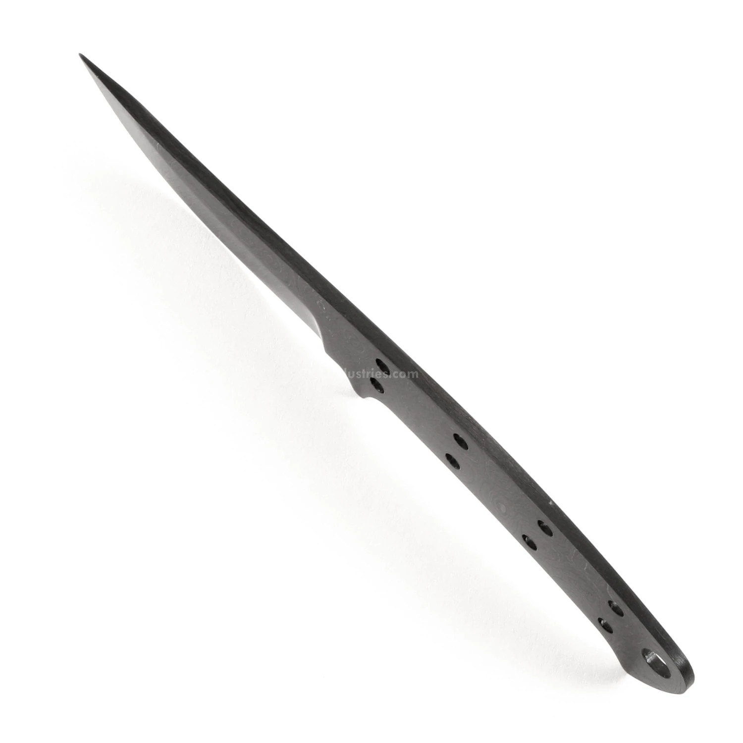 This hand-sized full tang knife kit design is called “Jim Dandy”. It is a USA Made carbon steel damascus fixed blade knife blank that is hollow-ground and ready to build. This full tang blade blank model is small enough to “hide away”, and makes a fantastic personal carry knife. It will also serve very well as a collectible gift project. The Jim Dandy trailing point knife kit has a blade length of 2.75 inches and an overall length of 6.25 inches. Ground on both sides, the blade is 0.75 inches wide. This full tang knife kit design features (8) 0.125 inch through-holes for handle construction (stainless steel pinstock included) with a 0.250 inch thong hole for an optional lanyard. The tang holes can be modified with ease to work with larger pinstock, or with threaded fasteners.