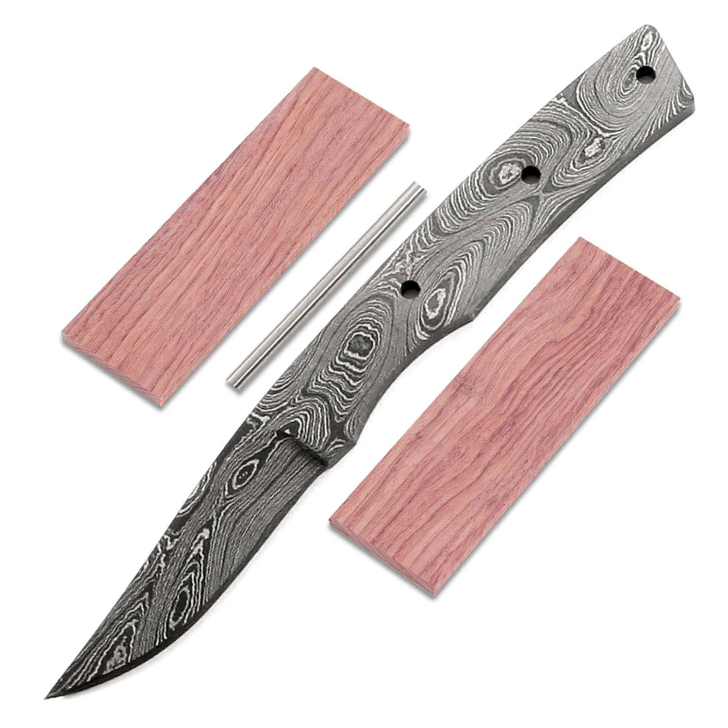 This damascus full tang knife kit design is called the “Lady Finger”. It is a USA Made carbon steel damascus fixed blade knife blank that is hollow-ground and ready to build. This full tang blade blank model is small and very well suited for a purse or wallet knife. With a blade length of 1.44 inches and an overall length of 3.75 inches, this design is a perfect conceal size. Ground on both sides, the Lady Finger’s blade is 0.375 inches wide. This small damascus full tang knife kit design features (3) 0.078 inch through-holes for handle construction (stainless steel pinstock included). The tang holes on this blade can be modified to work with larger pinstock, or with threaded fasteners.