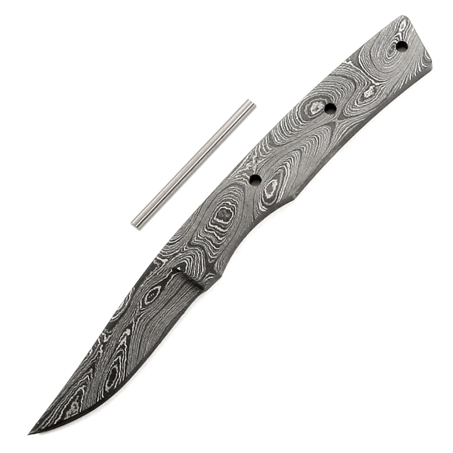 This damascus full tang knife kit design is called the “Lady Finger”. It is a USA Made carbon steel damascus fixed blade knife blank that is hollow-ground and ready to build. This full tang blade blank model is small and very well suited for a purse or wallet knife. With a blade length of 1.44 inches and an overall length of 3.75 inches, this design is a perfect conceal size. Ground on both sides, the Lady Finger’s blade is 0.375 inches wide. This small damascus full tang knife kit design features (3) 0.078 inch through-holes for handle construction (stainless steel pinstock included). The tang holes on this blade can be modified to work with larger pinstock, or with threaded fasteners.