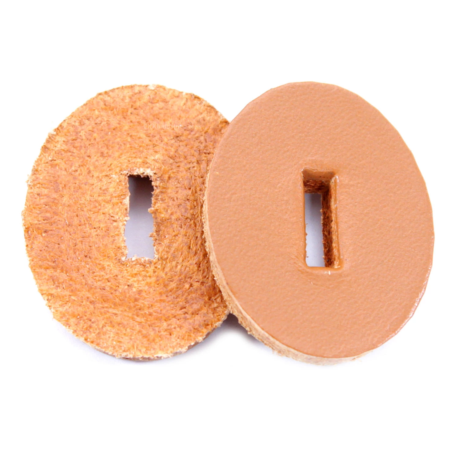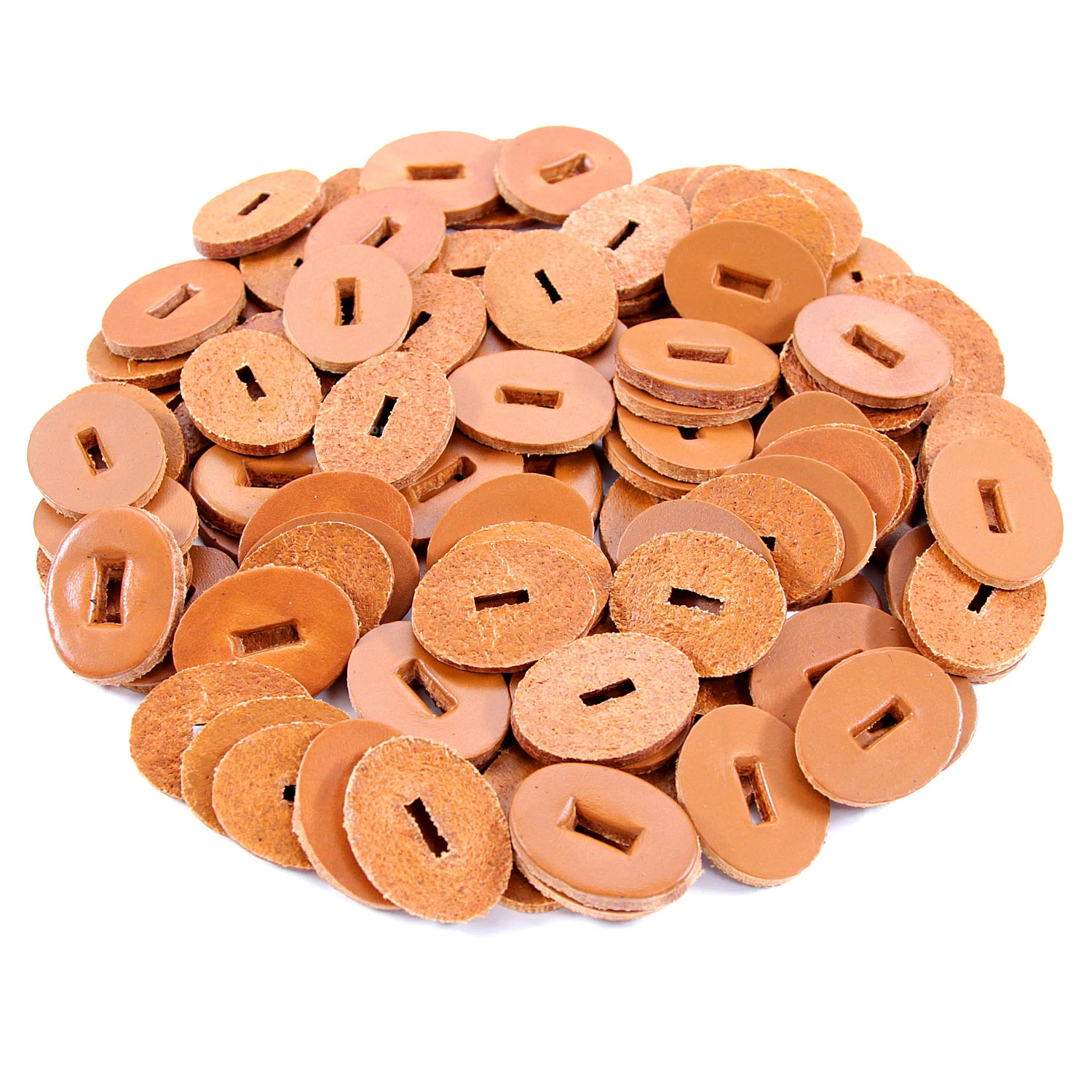 These are 1.30 x 1.00 x .125 inch leather handle washers. They are commonly used for creating custom handles on hidden tang knives. The inner opening is 0.40 x 0.120 inches and is designed for sliding over the tang of a knife. Once they are stacked, they can then be compressed into a uniform handle shape. After stacking and tightening, they can be sanded into the final handle configuration. These are high quality leather parts that are punched out of top-grain cowhide in our USA facility. Once finished, they create excellent handles for knives and tools, and feature high-griping, durable surfaces. This style of handle treatment has been used throughout history and is still one of the best performing ever developed. They are noted for creating one of the most comfortable handle treatments available. This type of knife handle is also quite simple to construct, and will last a lifetime.