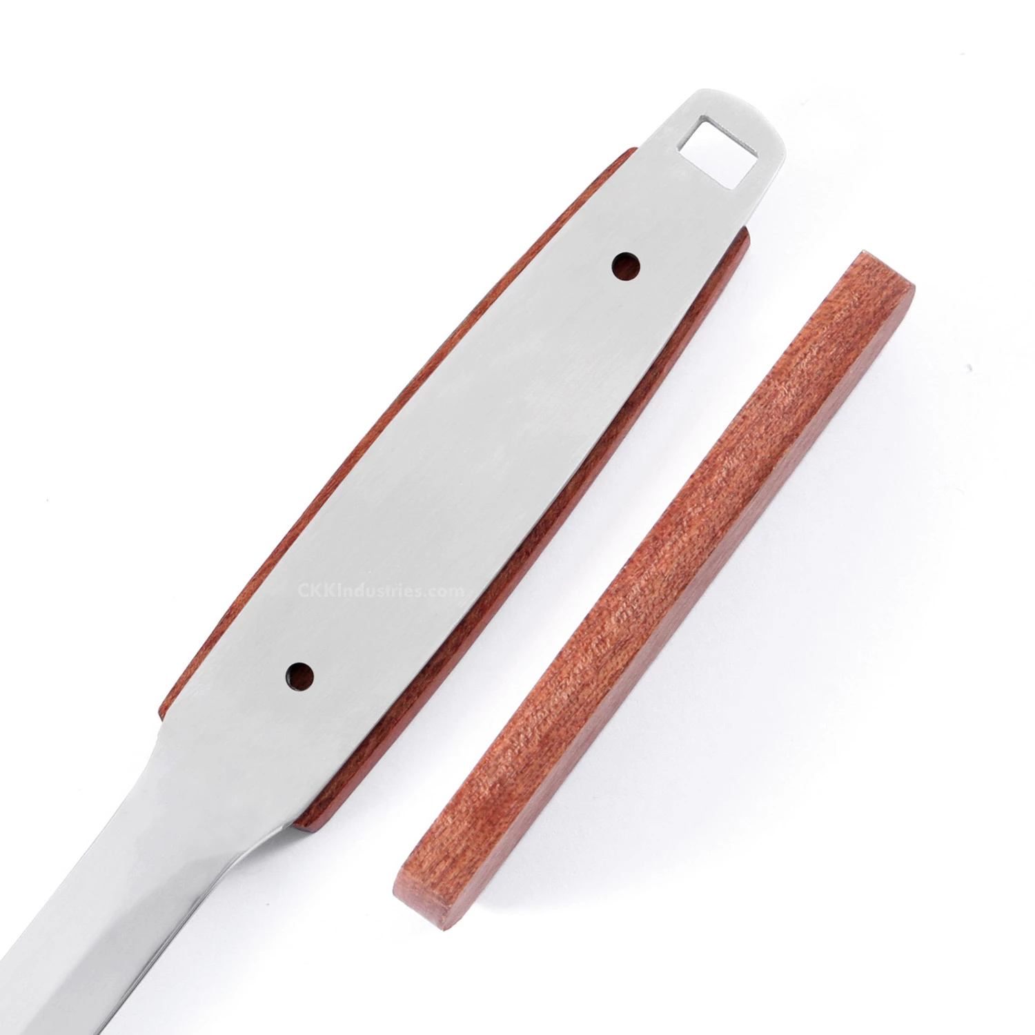 This version is the combo kit. It comes with the Letterman parts kit plus pre-machined Bloodwood handle scales to simplify the completion process. Add a touch of proper finishing and create a fabulous letter opener that you’ll be proud to own and use. Our pre-machined handle scales are slightly thicker and larger in diameter than the handle tang that they are designed for. This allows for proper sanding, shaping and artistic embellishment. These are also undrilled to allow for precise placement control and to maximize fastening options. If you want to begin from an easier starting point, the combo kit with pre-machined scales will help you insure that your kit completion will be smooth and successful.