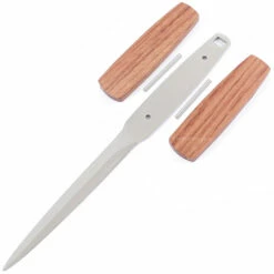 This version is the combo kit. It comes with the Letterman parts kit plus pre-machined Bubinga handle scales to simplify the completion process. Add a touch of proper finishing and create a fabulous letter opener that you’ll be proud to own and use. Our pre-machined handle scales are slightly thicker and larger in diameter than the handle tang that they are designed for. This allows for proper sanding, shaping and artistic embellishment. These are also undrilled to allow for precise placement control and to maximize fastening options. If you want to begin from an easier starting point, the combo kit with pre-machined scales will help you insure that your kit completion will be smooth and successful.