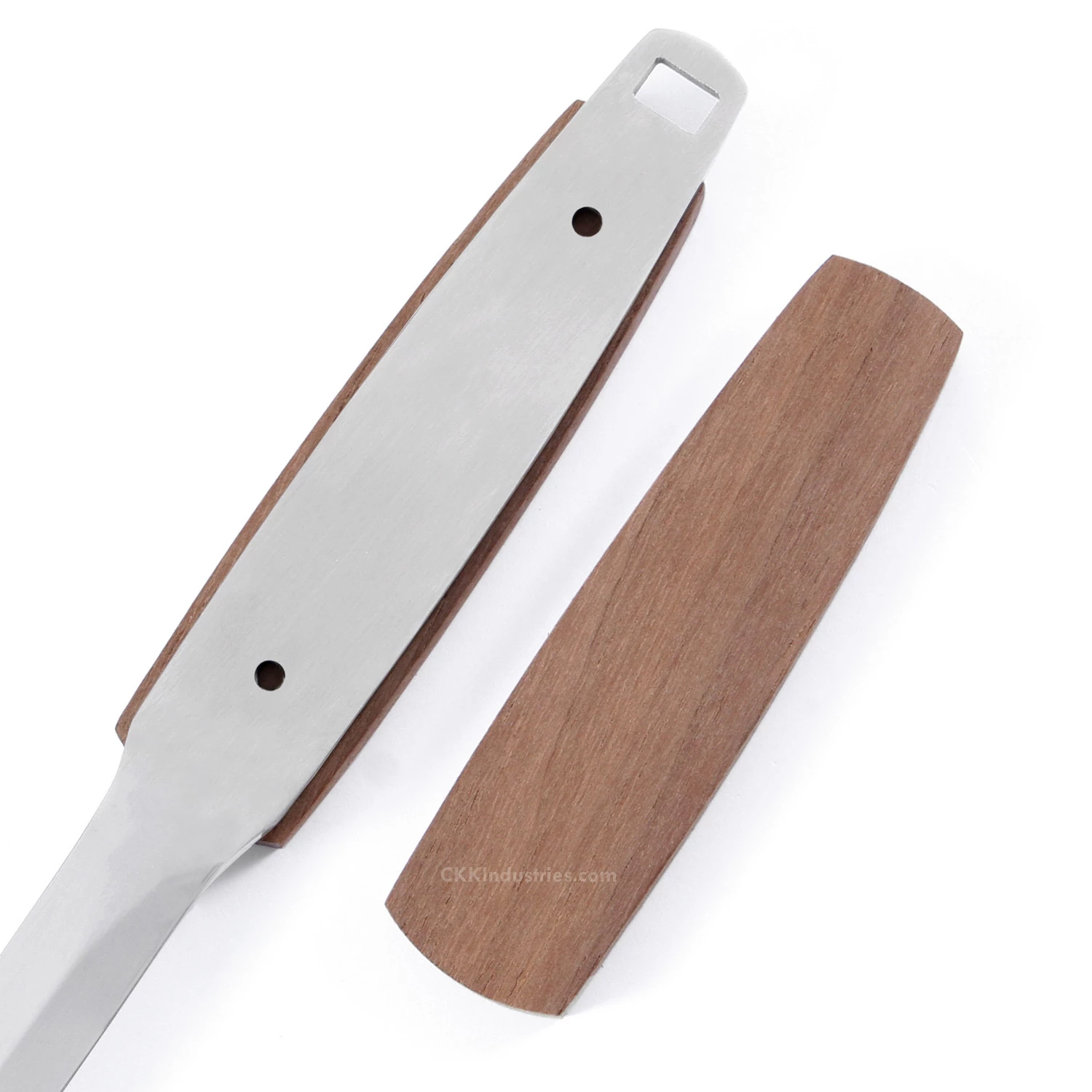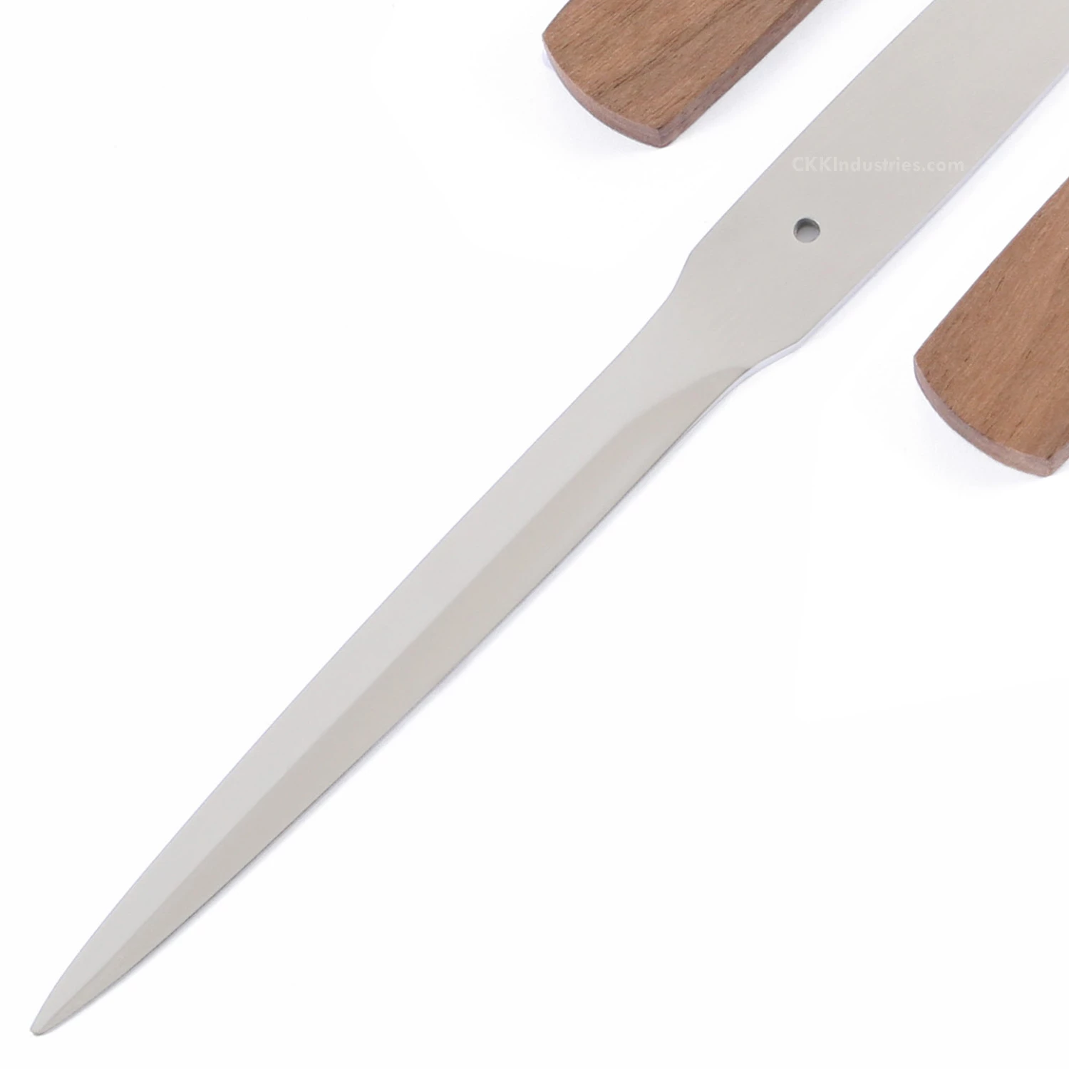 This version is the combo kit. It comes with the Letterman parts kit plus pre-machined Walnut handle scales to simplify the completion process. Add a touch of proper finishing and create a fabulous letter opener that you’ll be proud to own and use. Our pre-machined handle scales are slightly thicker and larger in diameter than the handle tang that they are designed for. This allows for proper sanding, shaping and artistic embellishment. These are also undrilled to allow for precise placement control and to maximize fastening options. If you want to begin from an easier starting point, the combo kit with pre-machined scales will help you insure that your kit completion will be smooth and successful.