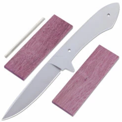 As a builder, you will be impressed with the precision of the grinds and the attention to detail in the Lil Sendero’s component parts. This version is the blade with handle pinstock, plus a matching set of Purpleheart wood handle scales to simplify the building process.