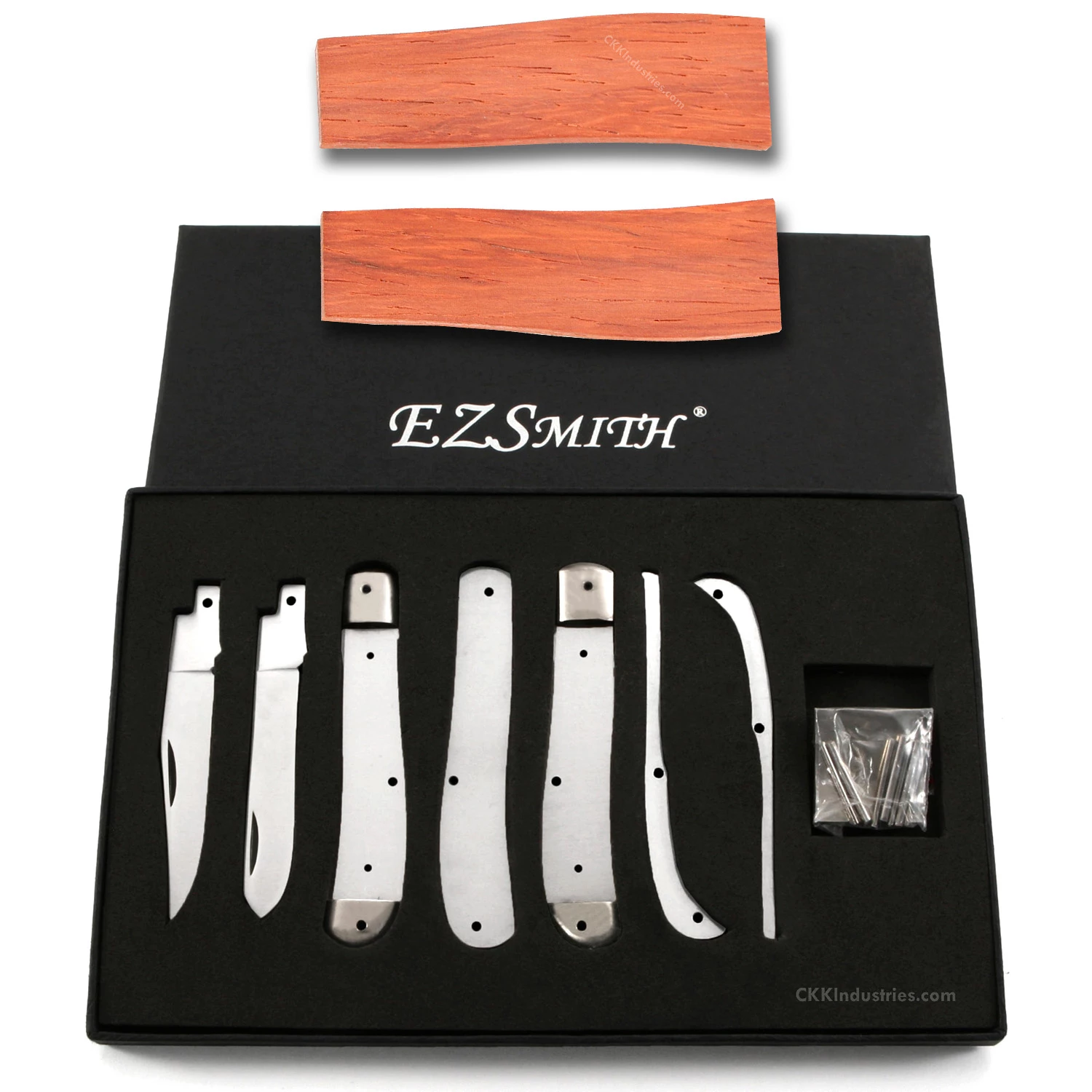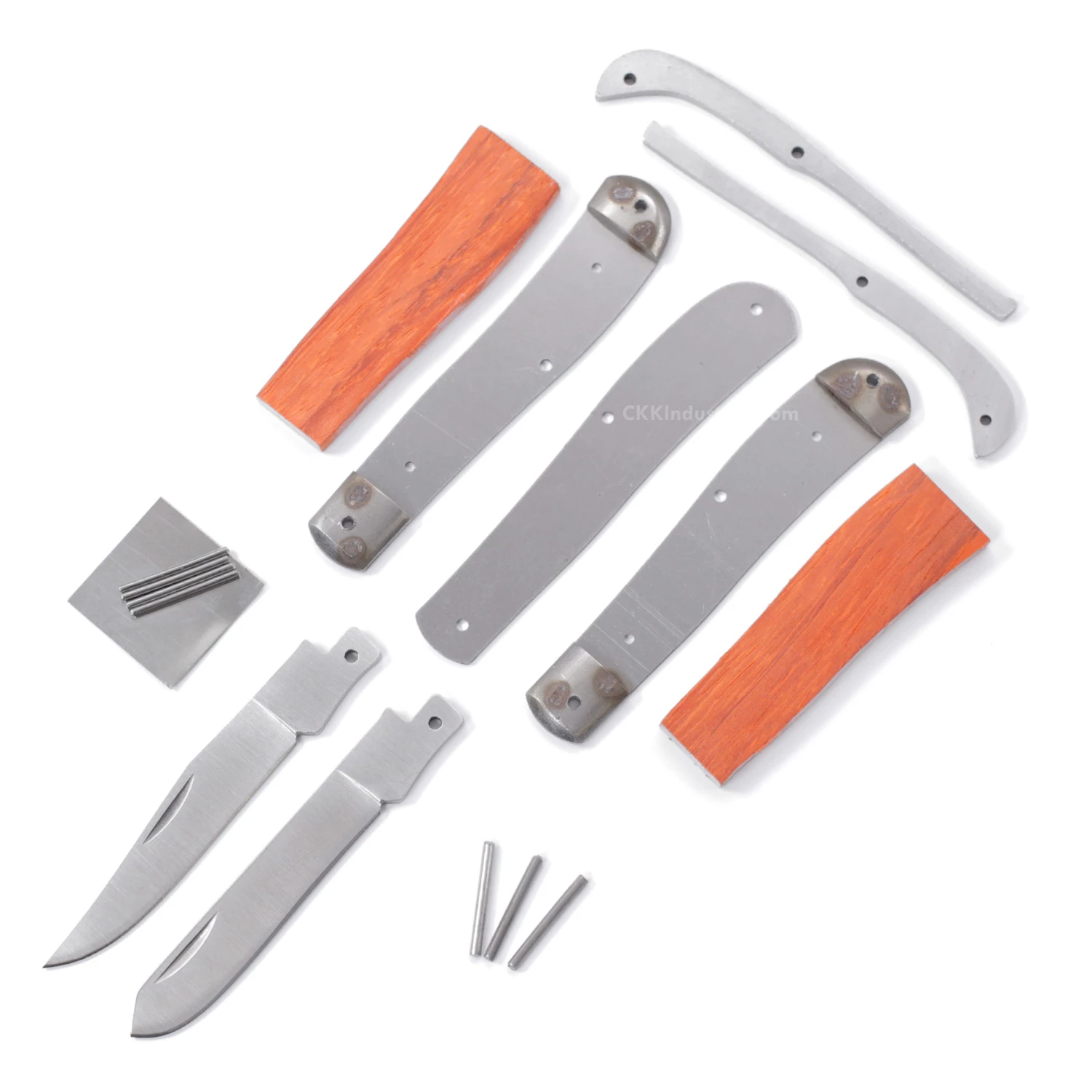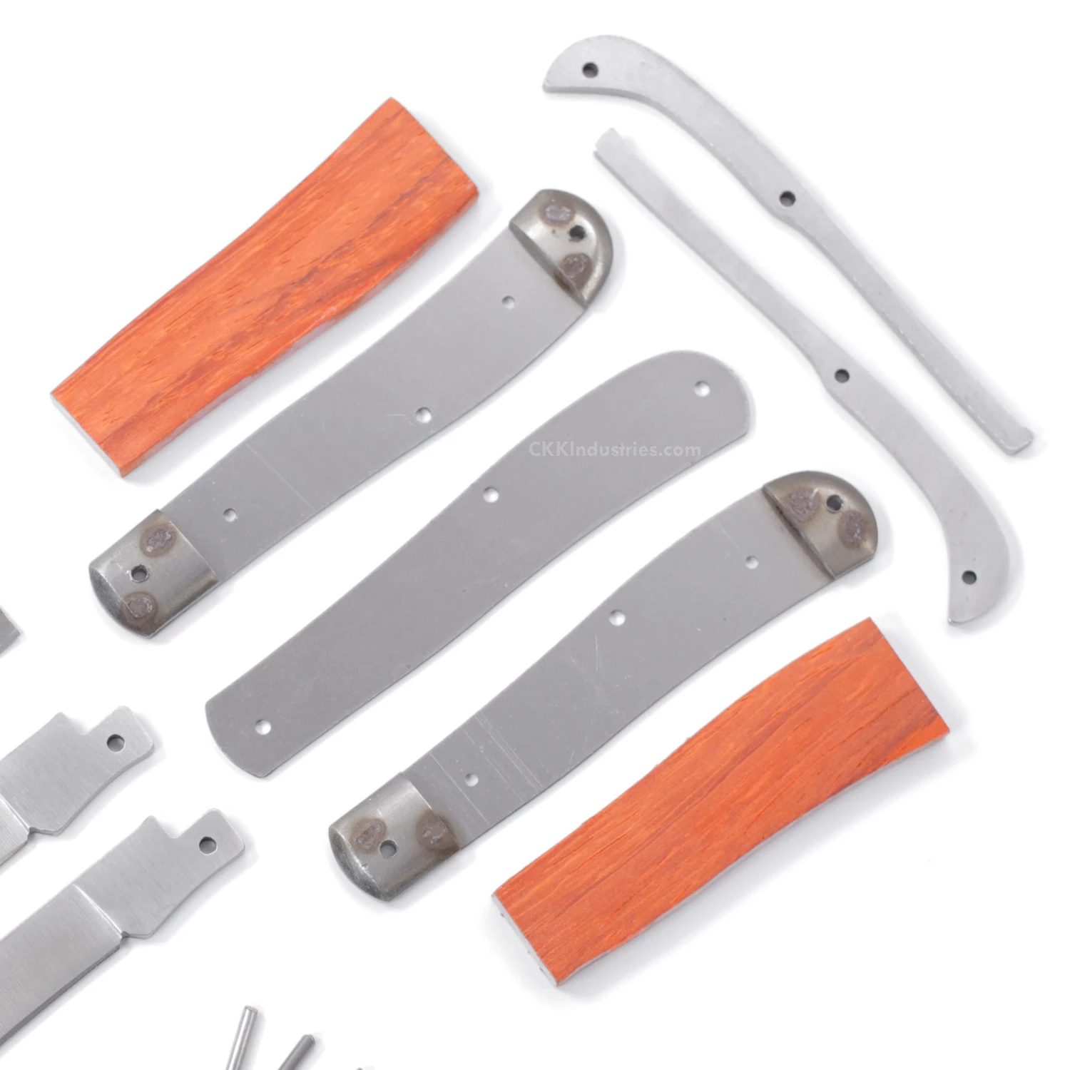 This version is the combo kit. It comes with the Lineman Trapper folding knife kit plus one pair of pre-machined Padauk handle inlays to simplify the completion process. This kit comes complete with assembly pins, shim stock, handle attachment pins, phosphorous-bronze pivot washers, and is gift boxed.