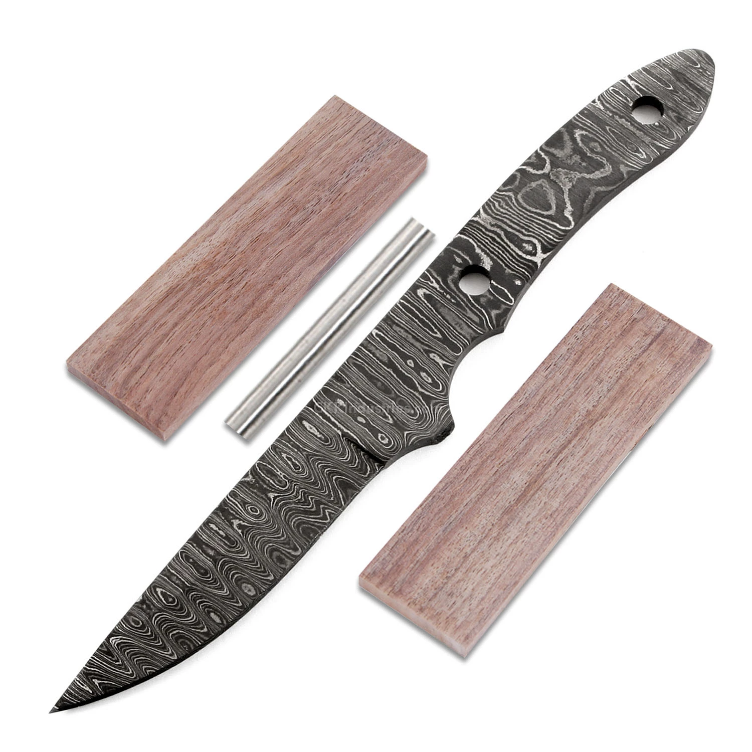 This damascus fixed blade knife kit design is called the “Little Viper”. It is a USA Made carbon steel damascus fixed blade knife blank that is hollow-ground and ready to build. This full tang knife blank model will make a fantastic personal carry knife. The damascus fixed blade knife kit is excellent and offers a a great feel in the hand. With a blade length of 3.375 inches and an overall length of 7.56 inches, this design is a perfect conceal carry size. Ground on both sides, the Little Viper’s blade is 0.8125 inches wide. This damascus blade blank design features (2) 0.250 inch through-holes for handle construction. The tang holes can be modified with ease to work with larger pinstock, or with threaded fasteners.