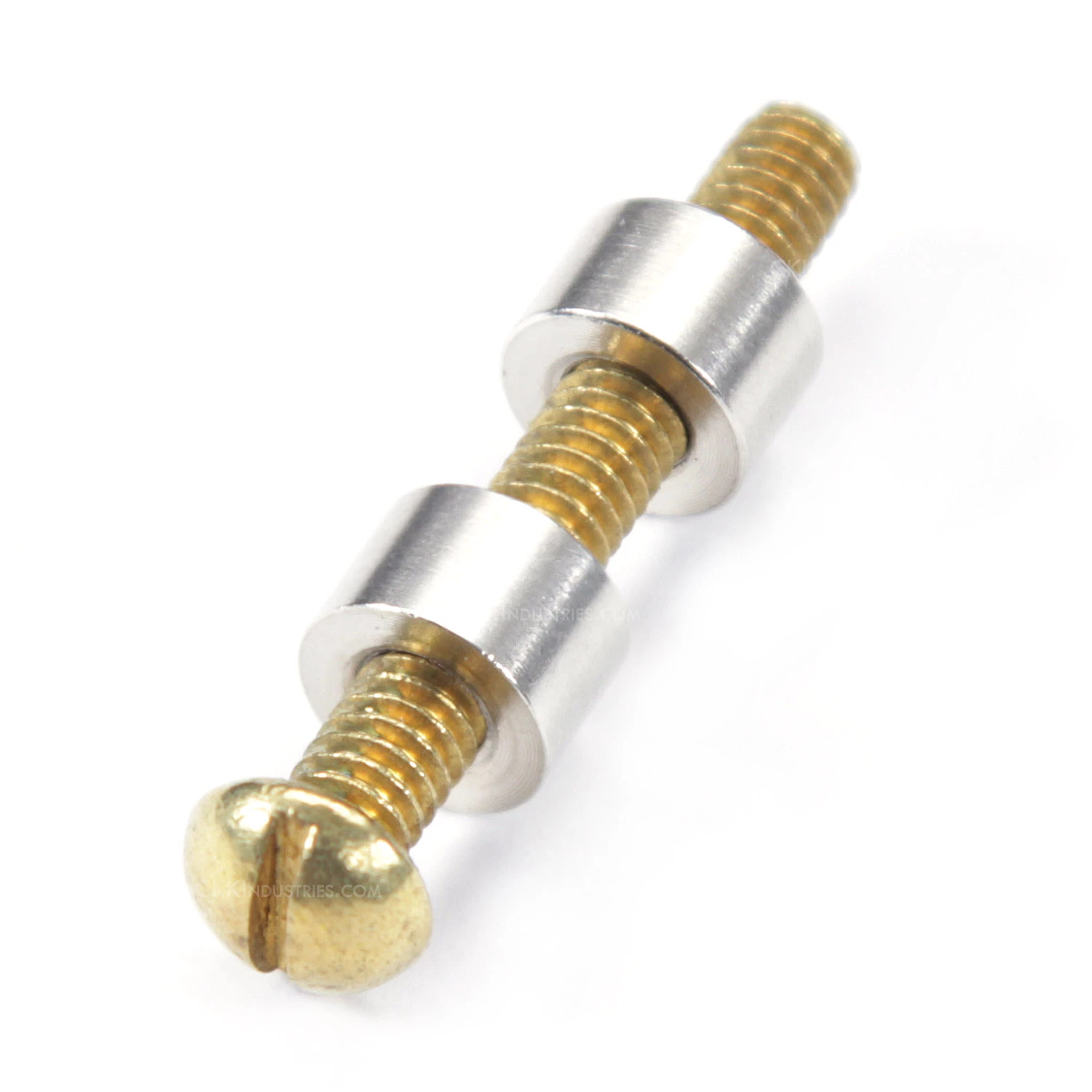 These are Loveless-Style Fasteners. They were originally introduced by knife making legend, Bob Loveless, and are used for affixing knife handles. Loveless-Style Fasteners are a 3-piece design and include (2) threaded heads and (1) threaded screw. With this design, you will create a step hole in each side of your handle material that is slightly larger than the shank of the threaded screw. The three-part assembly allows for you to pass the threaded screw precisely through your knife tang hole and handle material, allowing the larger radius of the Loveless-Style fastener heads to create pinch points on both sides of the handle material, where it can then be tightened down using the screw slot to a secure hold. Once the threaded heads have been tightened, the screw head can be removed and the assembly can be sanded to a flush finish with the handle surface. This will result in a very attractive final surface that resembles a bull’s-eye. Using different materials for both screw and heads will further the contrast of the effect. When used with epoxy and/or thread-locker adhesive, they will create a permanent handle bond.