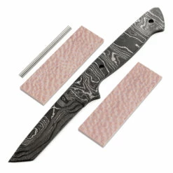 This damascus tanto knife kit design is called the “Lucha Tanto”. It is a USA Made carbon steel damascus fixed blade knife blank that is hollow-ground and ready to build. This tanto blade blank is small enough to “hideaway”, and makes a fantastic personal carry-sized knife when completed. The Lucha Tanto blade blank has a blade length of 3.00 inches and an overall length of 7.00 inches. Ground on both sides, the blade is 0.75 inches wide. This tanto knife kit design features (2) 0.156 inch through-holes for handle construction (stainless steel pinstock included). The tang holes can be modified with ease to work with larger pinstock, or with threaded fasteners.