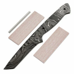 This damascus tanto knife kit design is called the “Lucha Tanto”. It is a USA Made carbon steel damascus fixed blade knife blank that is hollow-ground and ready to build. This tanto blade blank is small enough to “hideaway”, and makes a fantastic personal carry-sized knife when completed. The Lucha Tanto blade blank has a blade length of 3.00 inches and an overall length of 7.00 inches. Ground on both sides, the blade is 0.75 inches wide. This tanto knife kit design features (2) 0.156 inch through-holes for handle construction (stainless steel pinstock included). The tang holes can be modified with ease to work with larger pinstock, or with threaded fasteners.