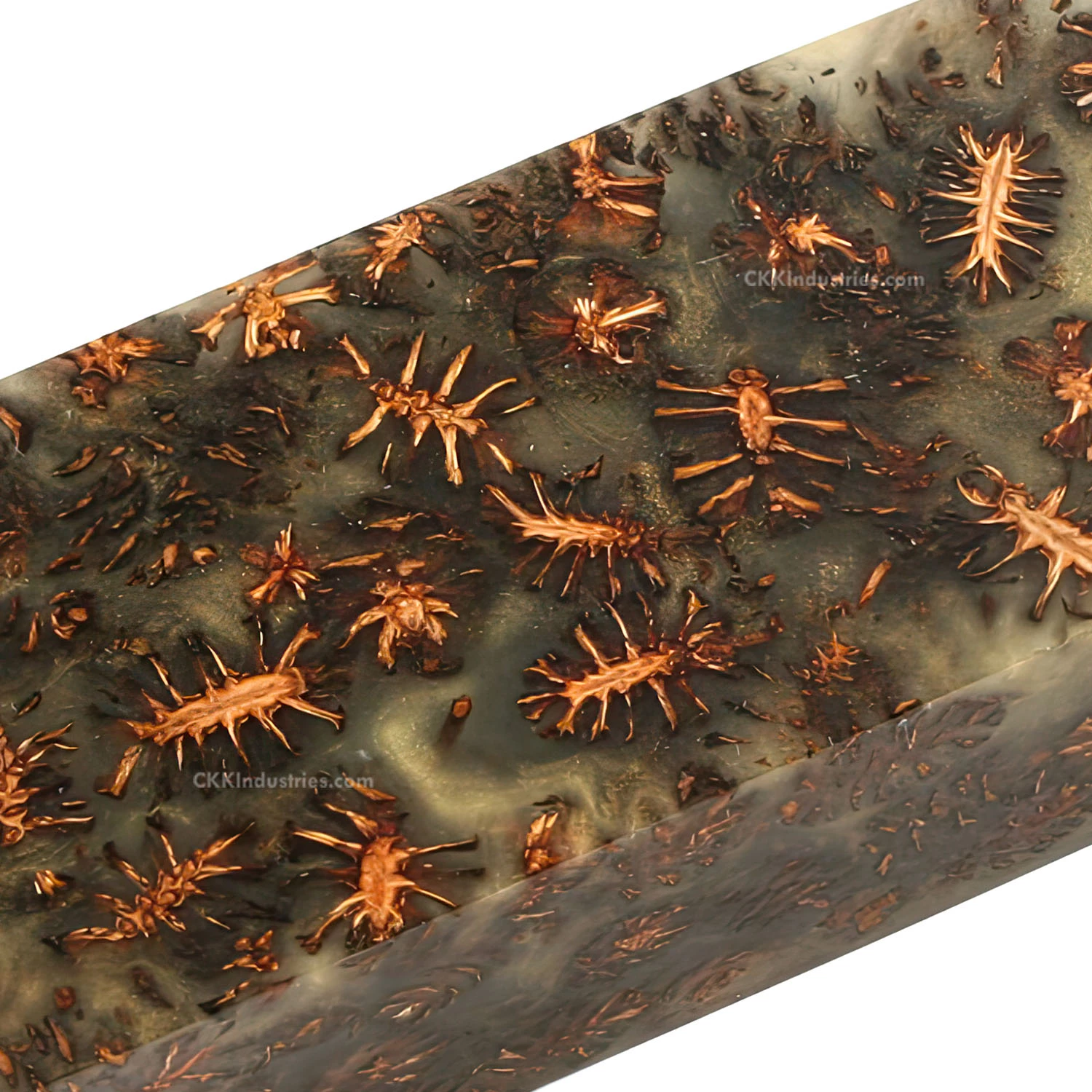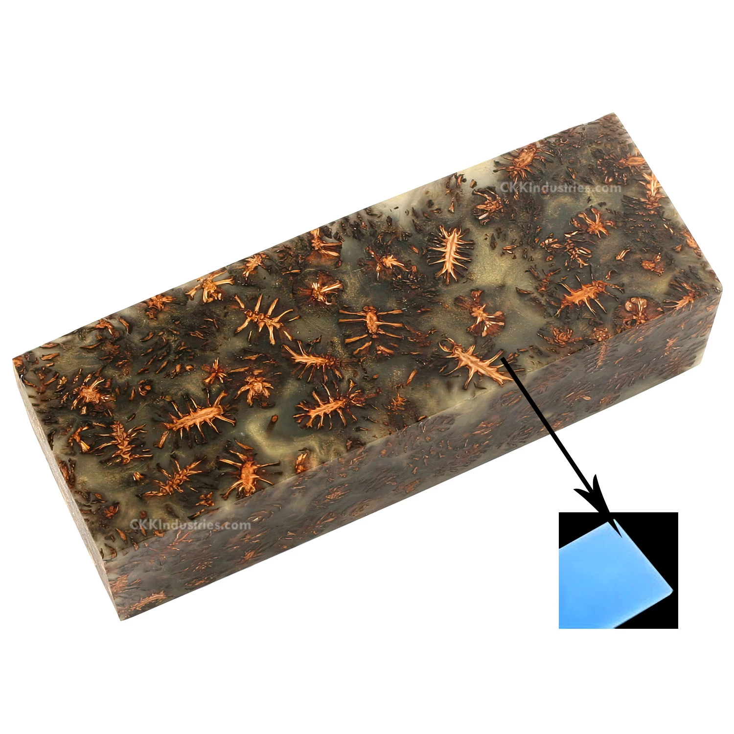 This is the latest handle material, called a “Sapphire Mini-Cone”. These knife handle blocks are highly unique, as they feature a miniature pine cone embedded in deluxe transparent glow-in-the-dark metallic resin. Each suspended cone knife handle blocks are beautifully arranged and exceptionally individual. If you’re looking for the perfect knife handle material for your next exotic creation, try a sapphire cone. This knife handle material features plenty of contrast and will polish to an amazing finish. This Sapphire Pine Cone knife handle block size is perfect for custom knife or gun grips. You can easily yield two or more full-sized knife handle scale sets from this block.