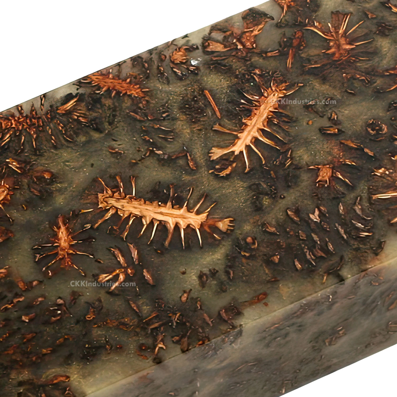 This is the latest handle material, called a “Sapphire Mini-Cone”. These knife handle blocks are highly unique, as they feature a miniature pine cone embedded in deluxe transparent glow-in-the-dark metallic resin. Each suspended cone knife handle blocks are beautifully arranged and exceptionally individual. If you’re looking for the perfect knife handle material for your next exotic creation, try a sapphire cone. This knife handle material features plenty of contrast and will polish to an amazing finish. This Sapphire Pine Cone knife handle block size is perfect for custom knife or gun grips. You can easily yield two or more full-sized knife handle scale sets from this block.