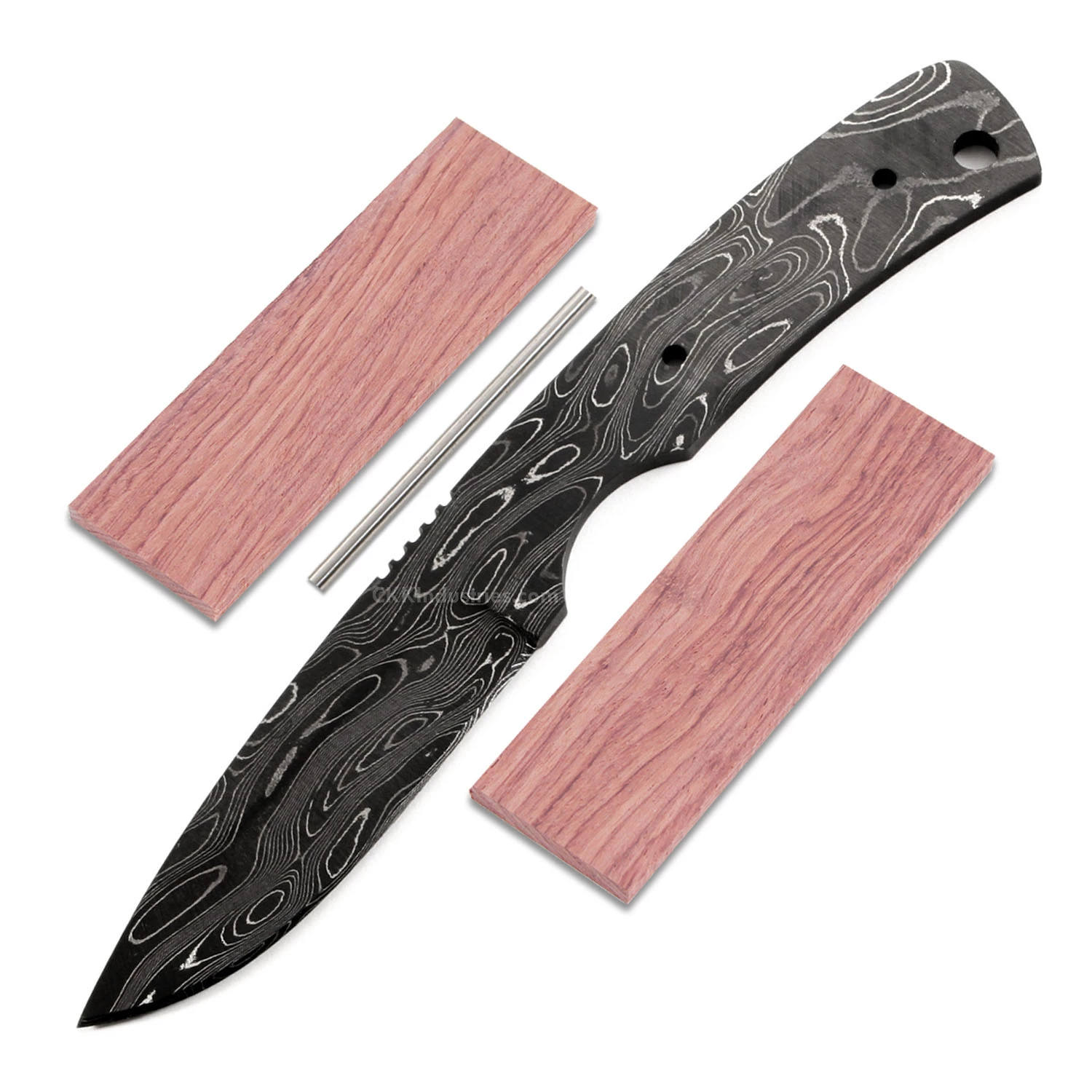 This damascus spear point knife kit design is called the “Lynx”. It is a USA Made carbon steel damascus fixed blade knife blank that is hollow-ground and ready to build. This damascus spear point knife blank model is a great size for a personal carry knife. Based on the simplicity of the design, it would also serve very well as a collectible gift project. With a blade length of 2.75 inches and an overall length of 7.125 inches, this design is very popular as a personal utility knife. Ground on both sides, the blade is 0.93 Inches wide. This damascus full tang blade blank design features (2) 0.156 inches through-holes for handle construction (stainless steel pinstock included) with a 0.250 inch thong hole for an optional lanyard, if desired. The tang holes can be modified with ease to work with larger pinstock, or with threaded fasteners.