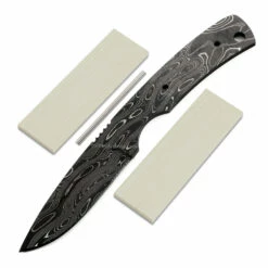 This damascus spear point knife kit design is called the “Lynx”. It is a USA Made carbon steel damascus fixed blade knife blank that is hollow-ground and ready to build. This damascus spear point knife blank model is a great size for a personal carry knife. Based on the simplicity of the design, it would also serve very well as a collectible gift project. With a blade length of 2.75 inches and an overall length of 7.125 inches, this design is very popular as a personal utility knife. Ground on both sides, the blade is 0.93 Inches wide. This damascus full tang blade blank design features (2) 0.156 inches through-holes for handle construction (stainless steel pinstock included) with a 0.250 inch thong hole for an optional lanyard, if desired. The tang holes can be modified with ease to work with larger pinstock, or with threaded fasteners.